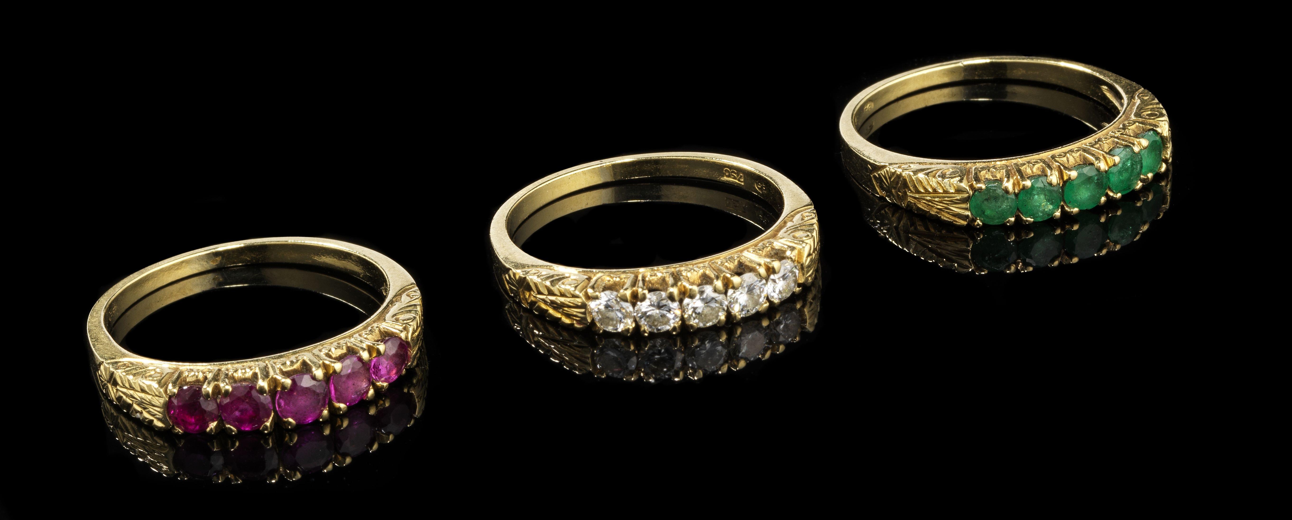 4114. Lot de trois anneaux ciselés sertis, l'un d'une ligne de diamants (env. 0,5 ct), l'un d'une ligne de rubis et l'un d'une ligne d'émeraudes