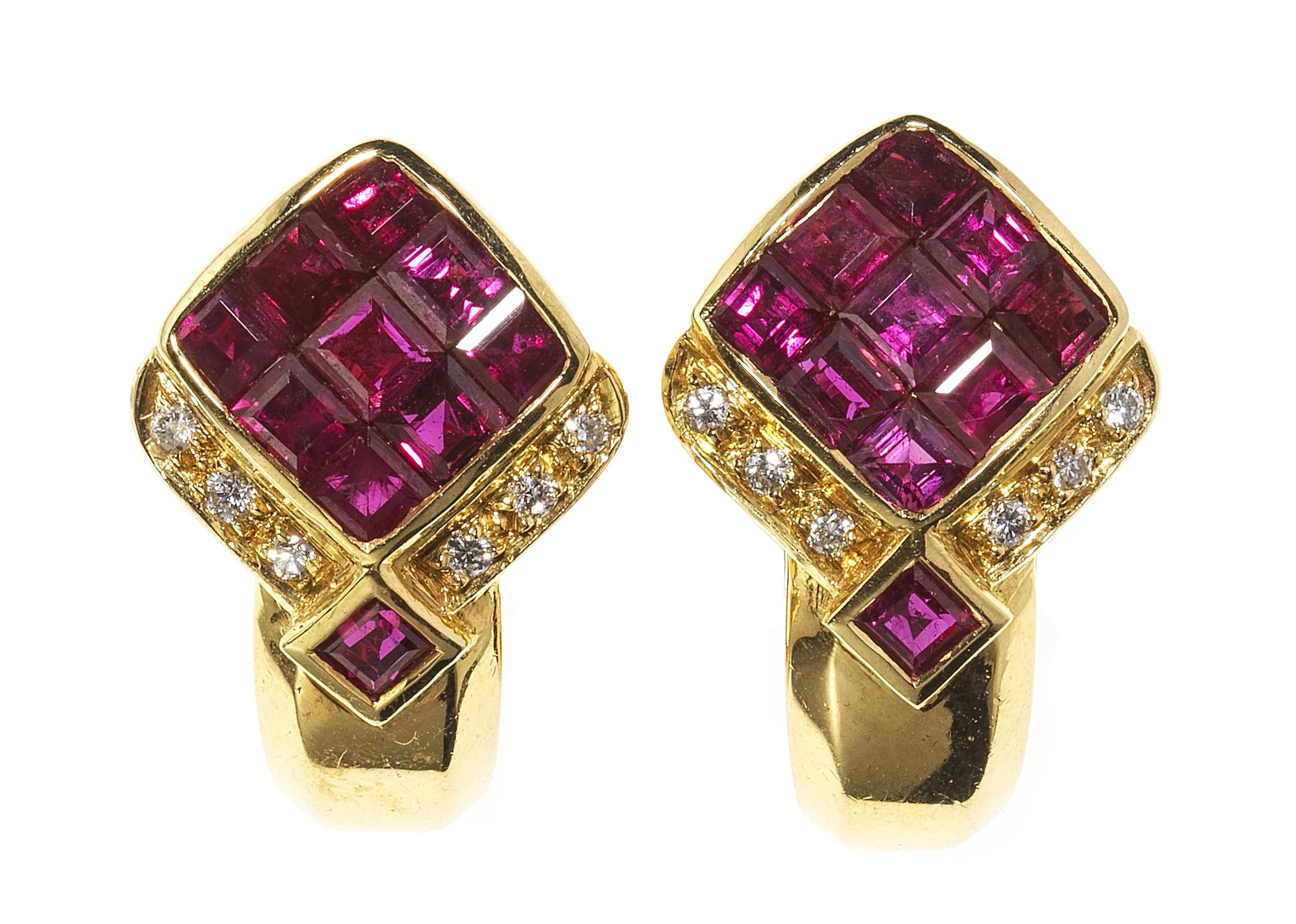 4117. Clips d'oreilles sertis d'un motif de rubis calibrés en serti invisible rehaussé de lignes de diamants