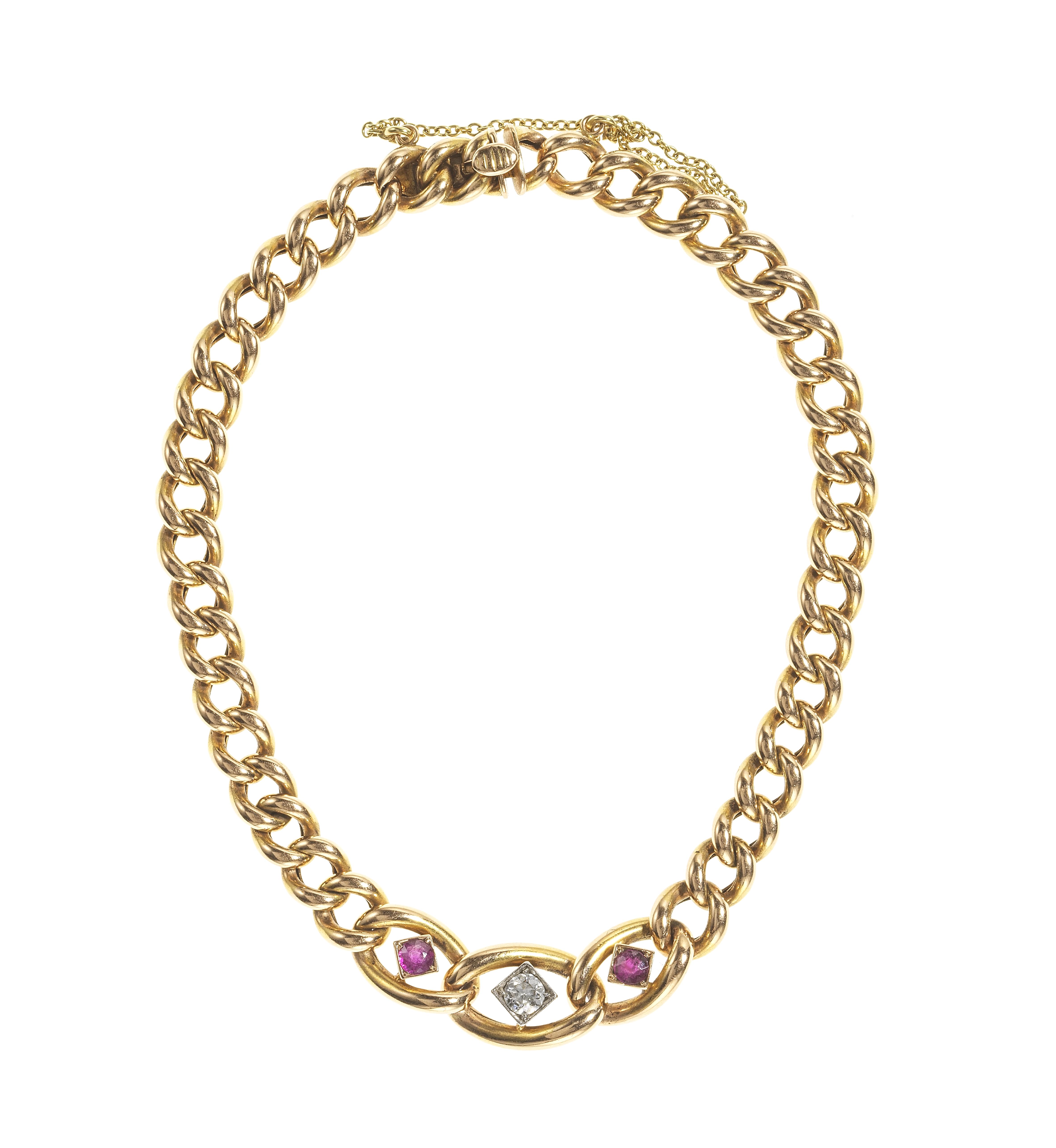 4134. Bracelet à maille gourmette centré d'un diamant (env. 0,2 ct) épaulé de deux rubis