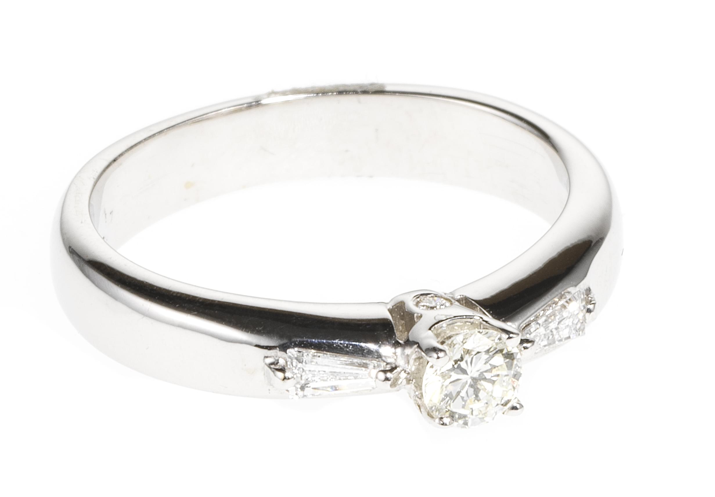 4137. Bague solitaire sertie d'un diamant (env. 0,20 ct) épaulé de diamants taille trapèze