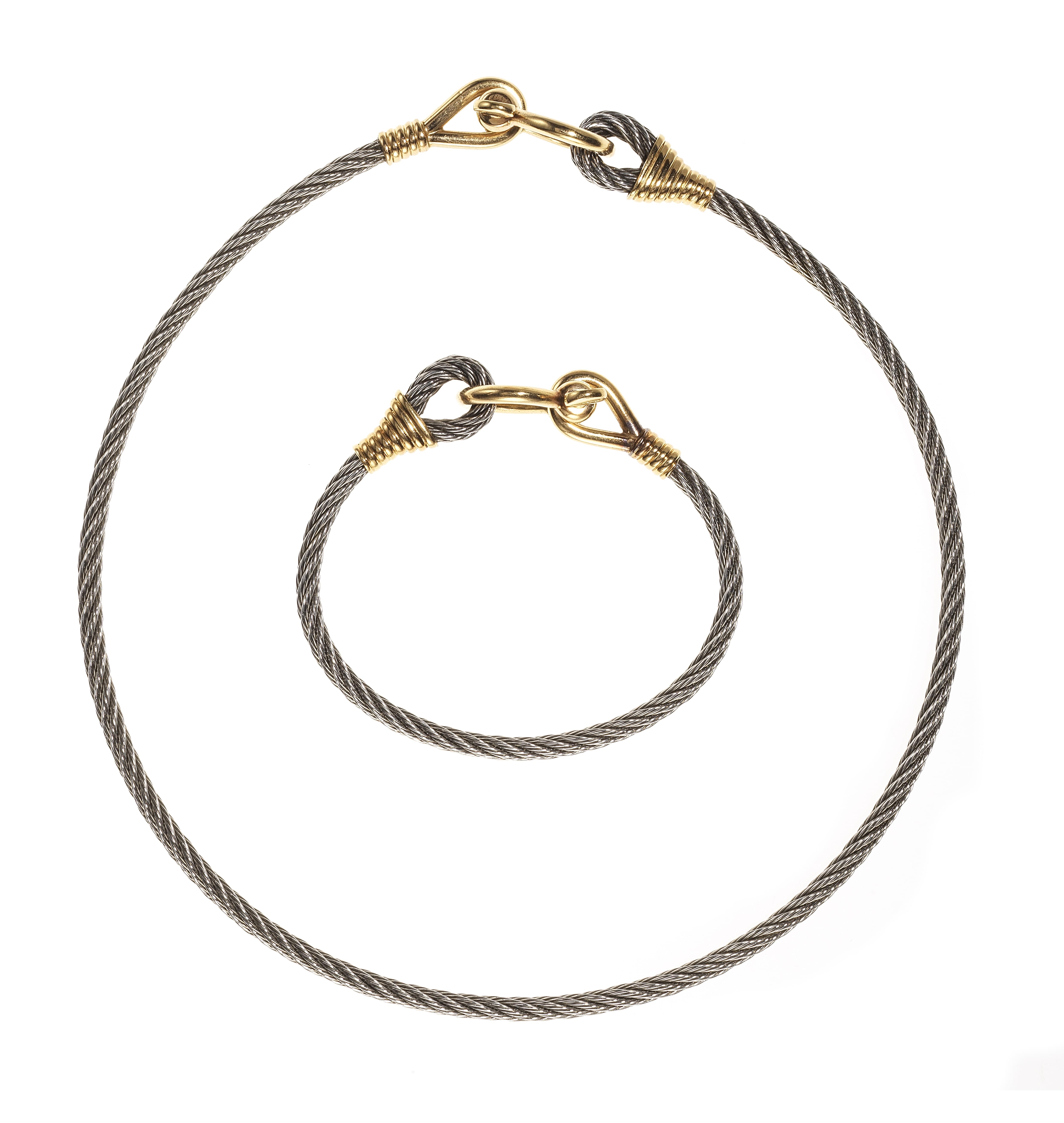 4145. Ensemble d'un collier et d'un bracelet bicolores à maille torsadée terminés par un fermoir manille