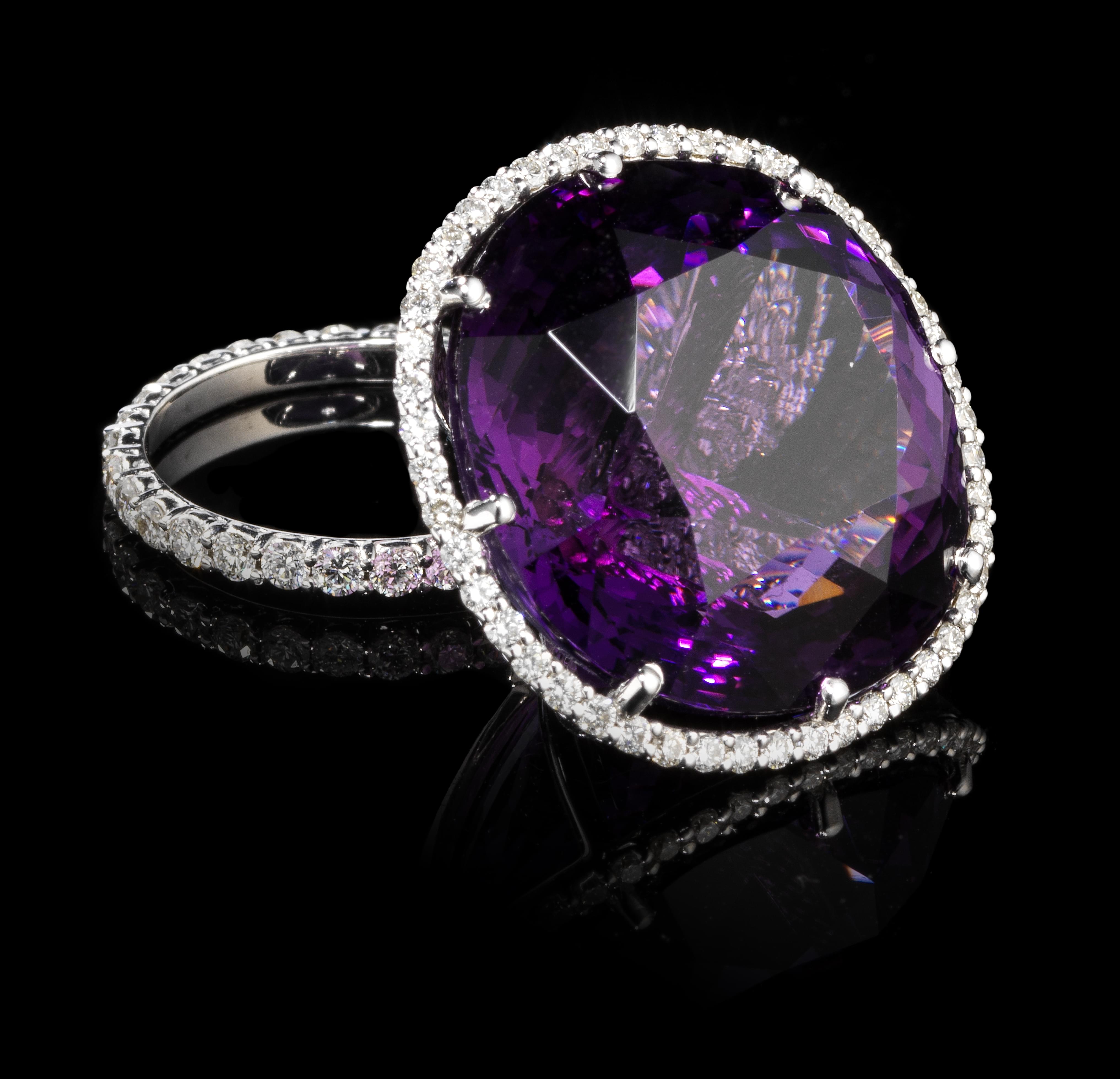 4163. Bague sertie d'une améthyste taille brillant mobile (env. 30 ct) entourée de diamants