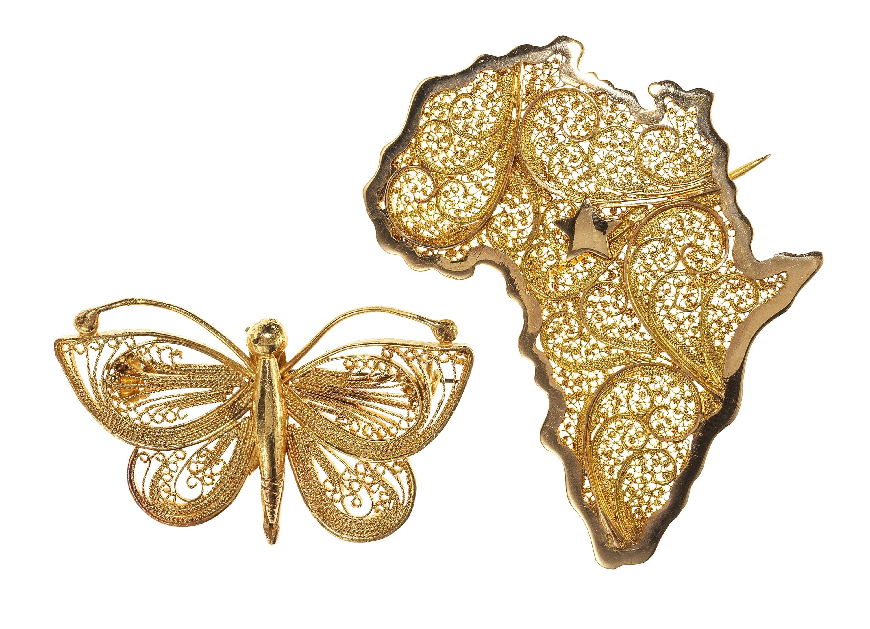L'une à motif de papillon et l'autre figurant l'Afrique, or 750, épingles en métal, H 6 cm, L 4,5 cm, 21 g