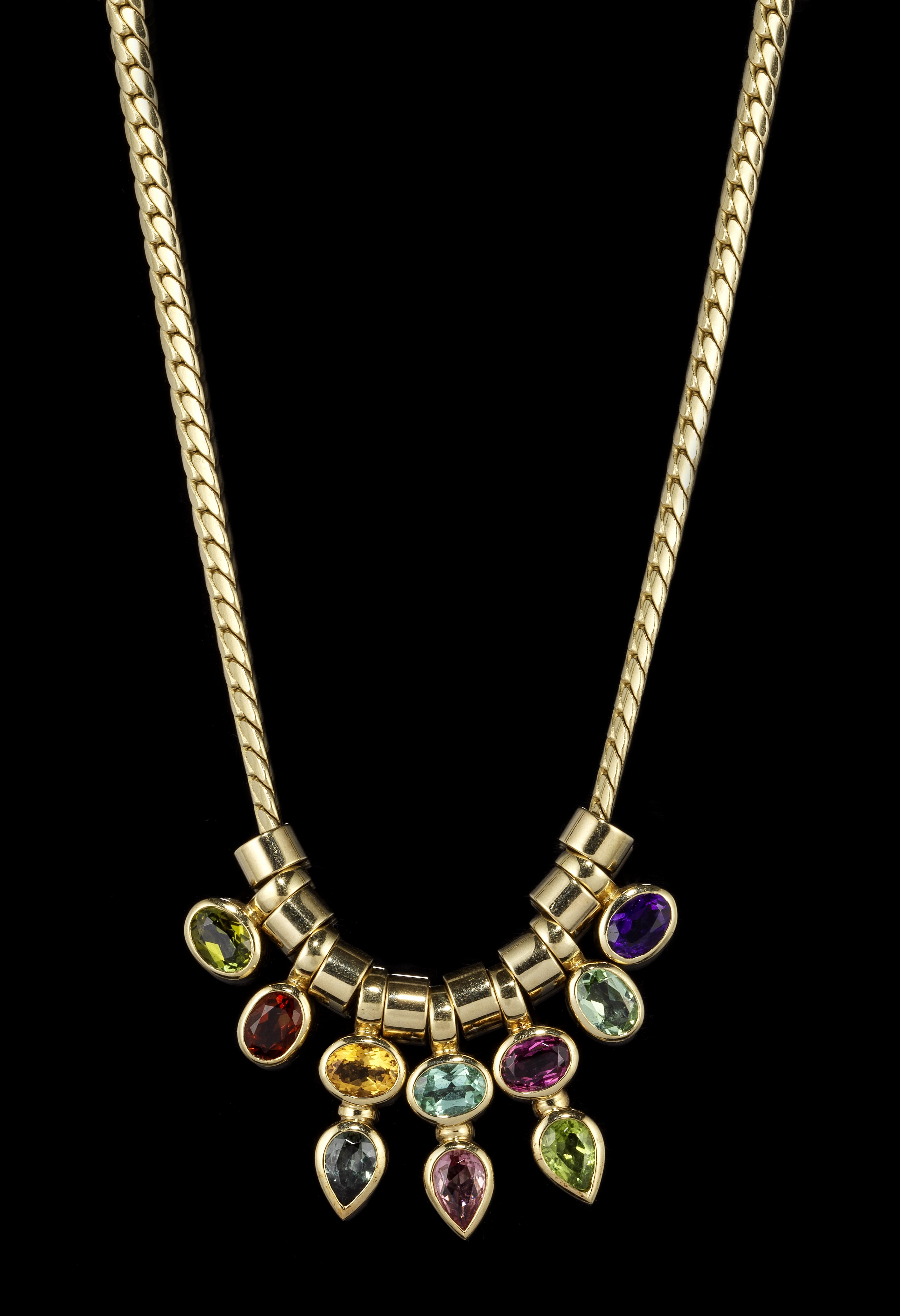 Orné de trois motifs sertis chacun d'une émeraude, d'un rubis et...