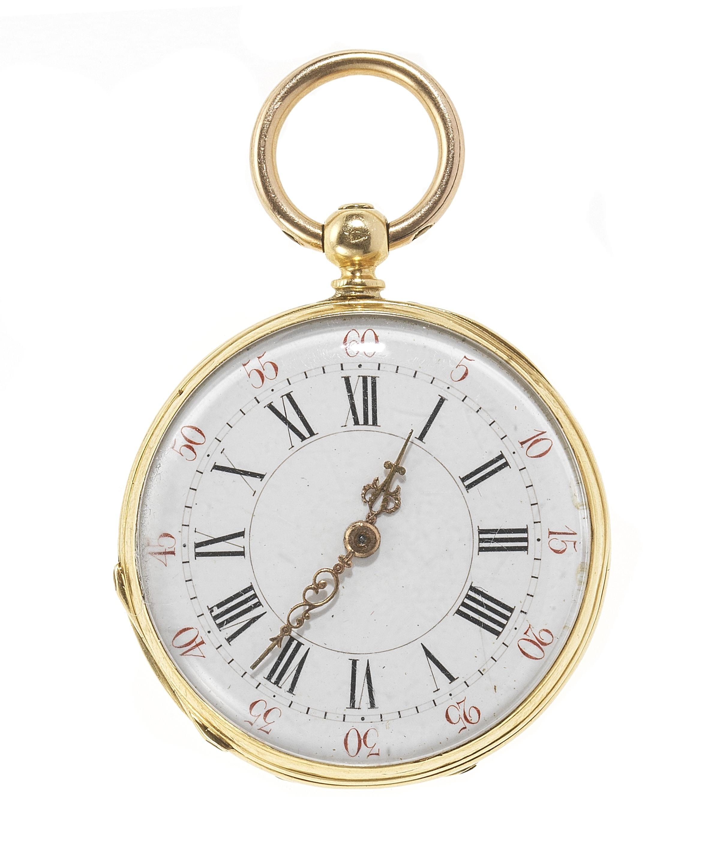 Cadran émaillé blanc, aiguilles dorées, chiffres romains noirs, travail français, or 750, D 32 mm, poids brut 25 g