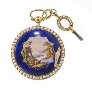 4280. Montre de poche à décor guilloché émaillé bleu peint d'une scène champêtre et entouré de demi-perles