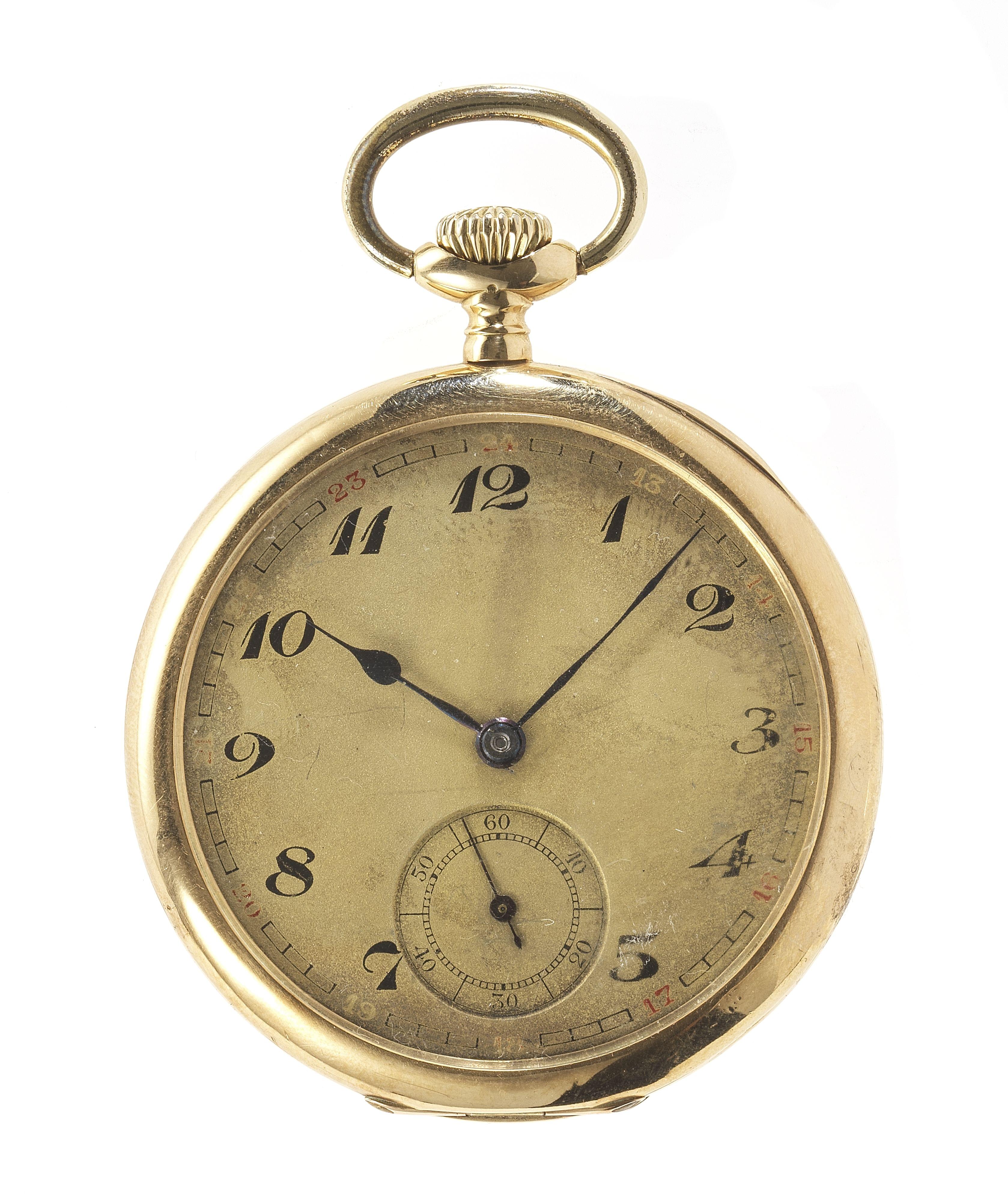 Cadran doré, aiguilles et chiffres arabes noirs, secondes à 6h, or 585, cuvette et boucle en métal, D 50 mm, poids brut 72 g
