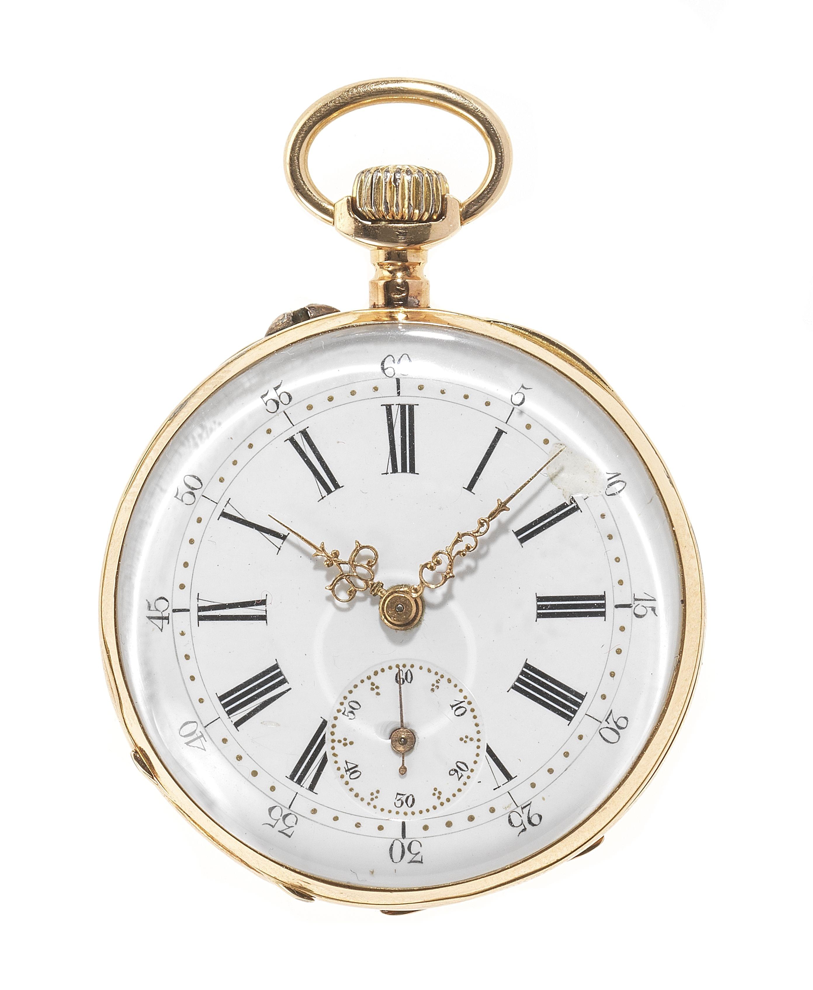 Cadran émaillé blanc, aiguilles dorées, chiffres romains noirs, secondes à 6h, travail français, or 750, D 40 mm, poids brut 51 g