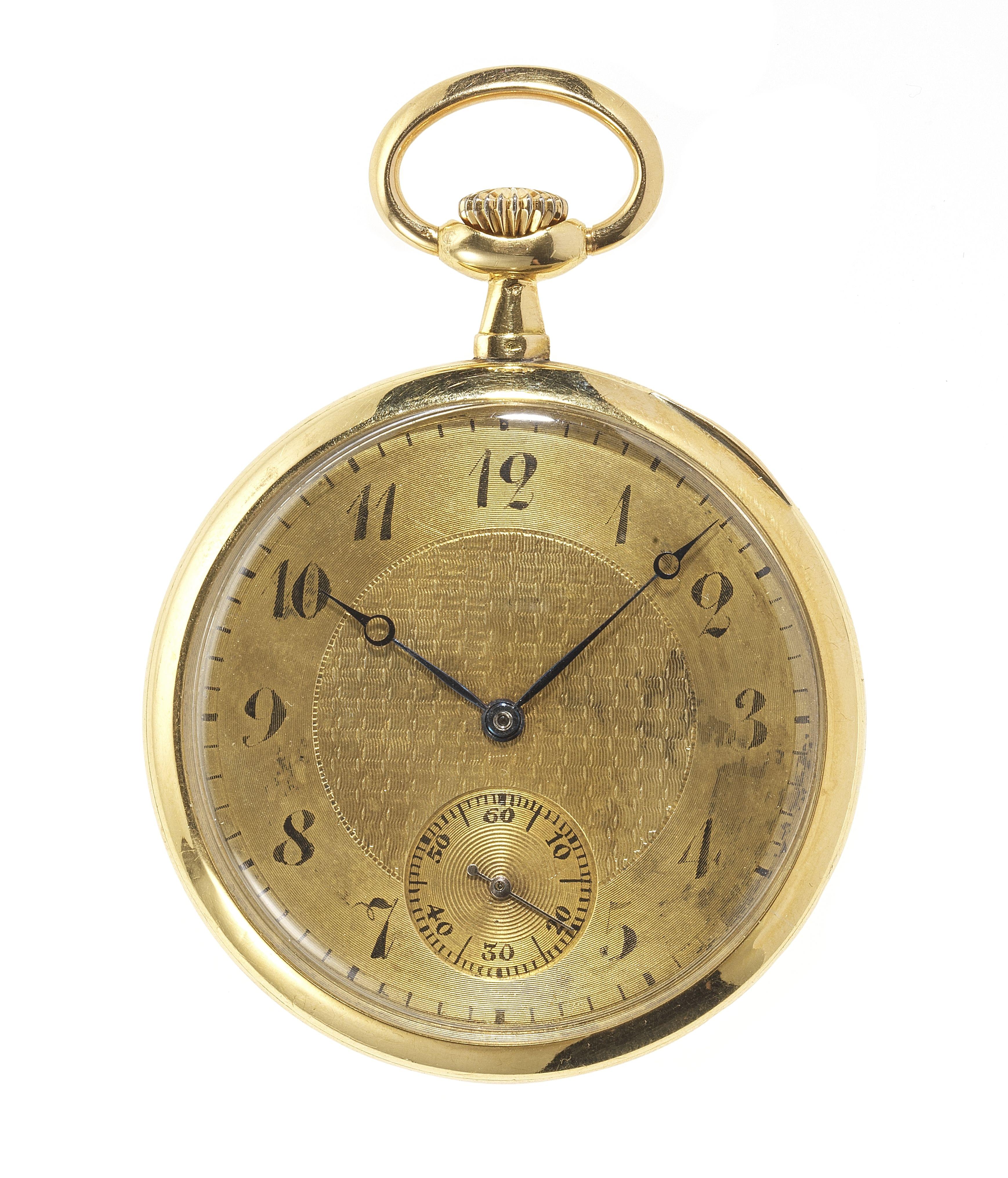 Cadran guilloché doré, aiguilles bleues et chiffres arabes noirs, secondes à 6h, or 750, D 50 mm, poids brut 65 g