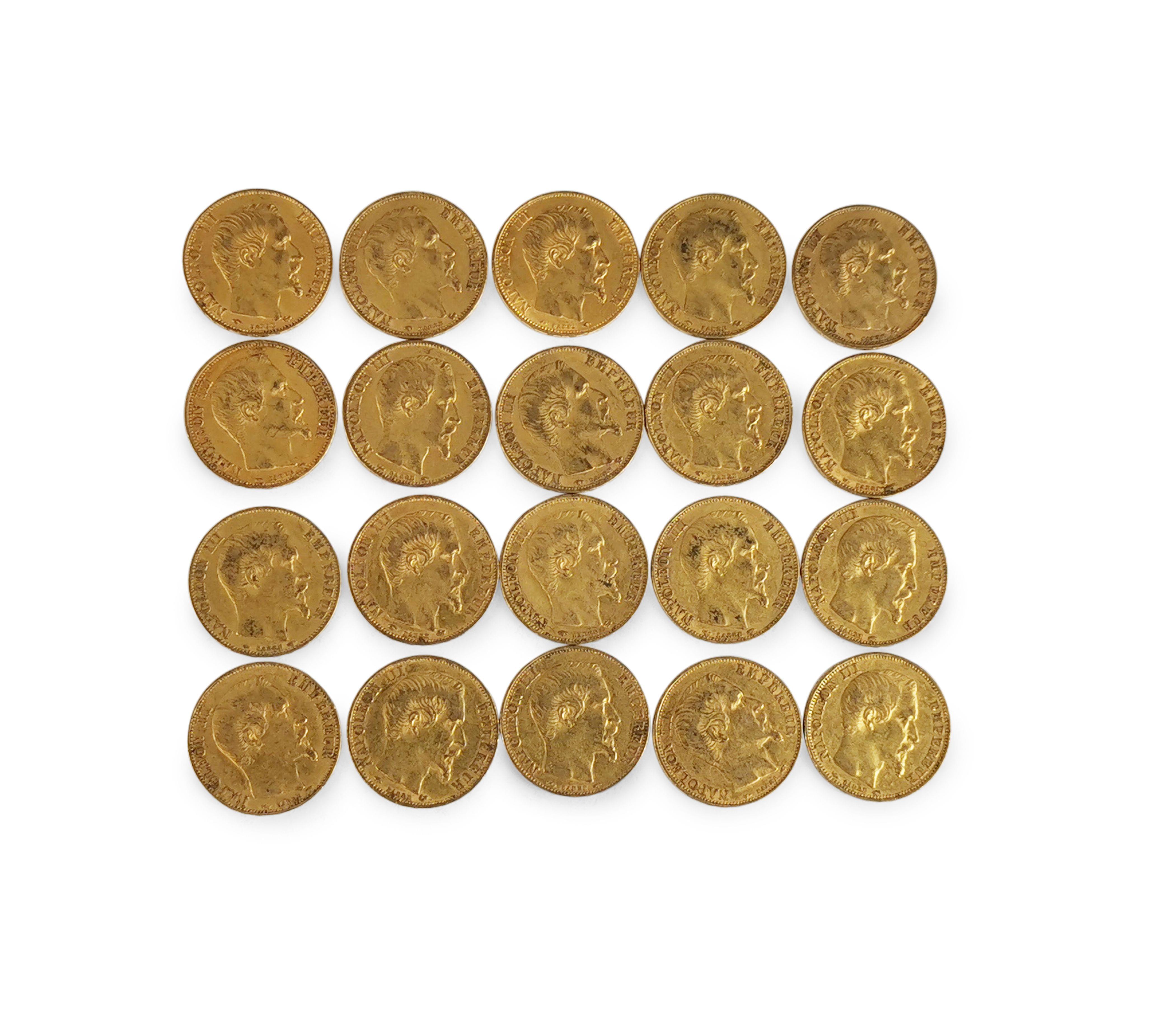 4366. Lot de vingt pièces de 20 francs Napoléon III (tête nue)