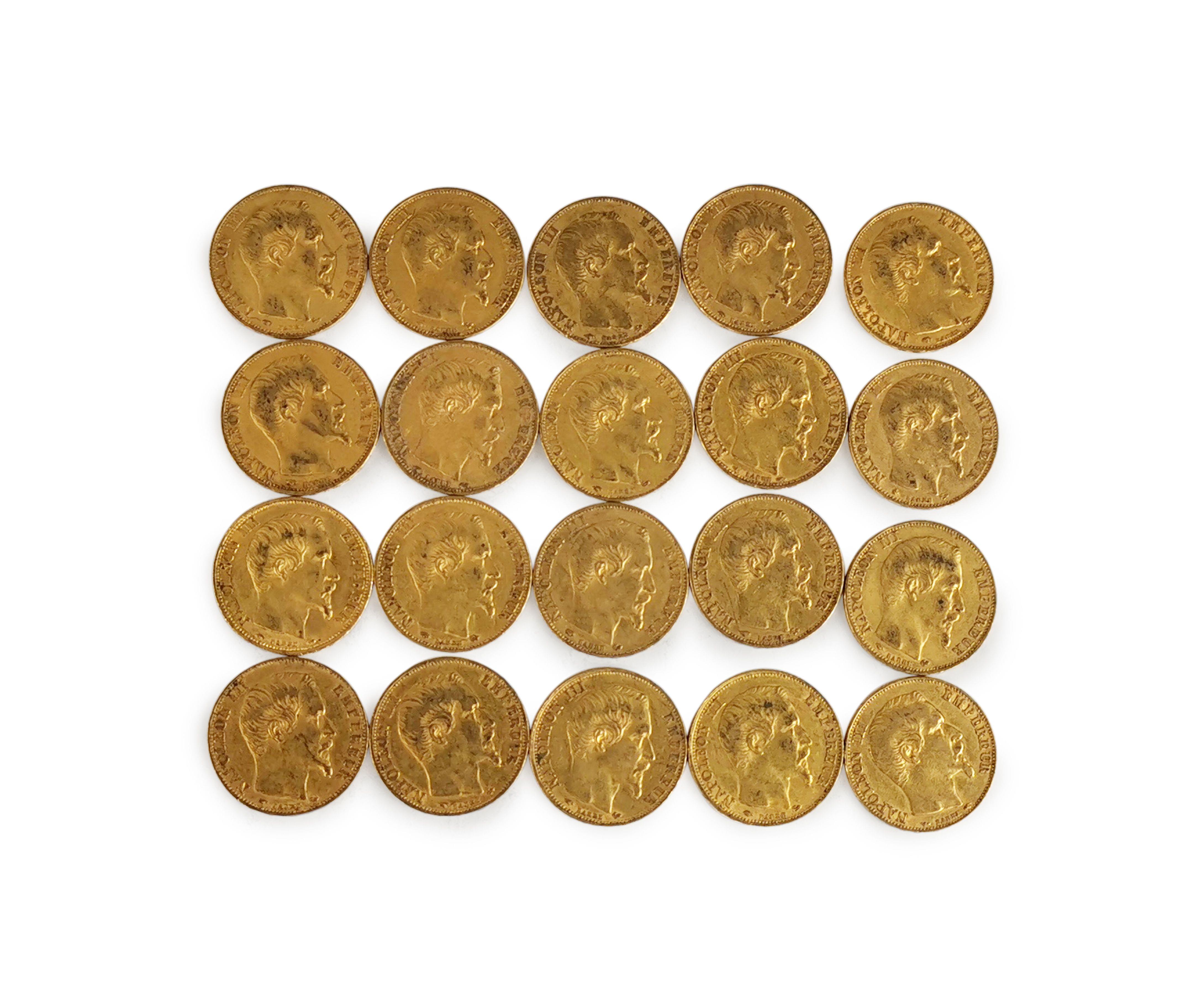 4367. Lot de vingt pièces de 20 francs Napoléon III (tête nue)