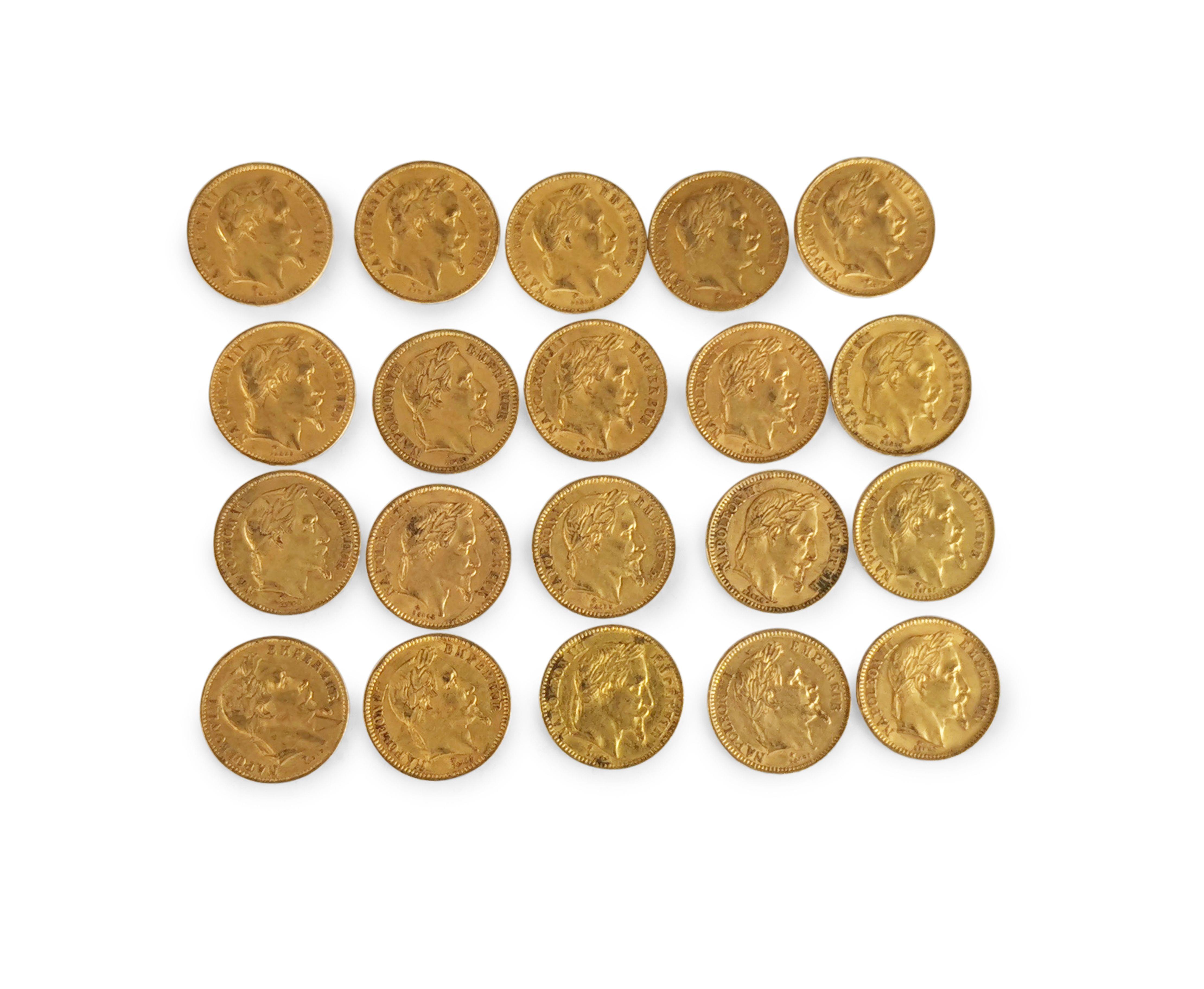 4371. Lot de vingt pièces de 20 francs Napoléon III (tête laurée)