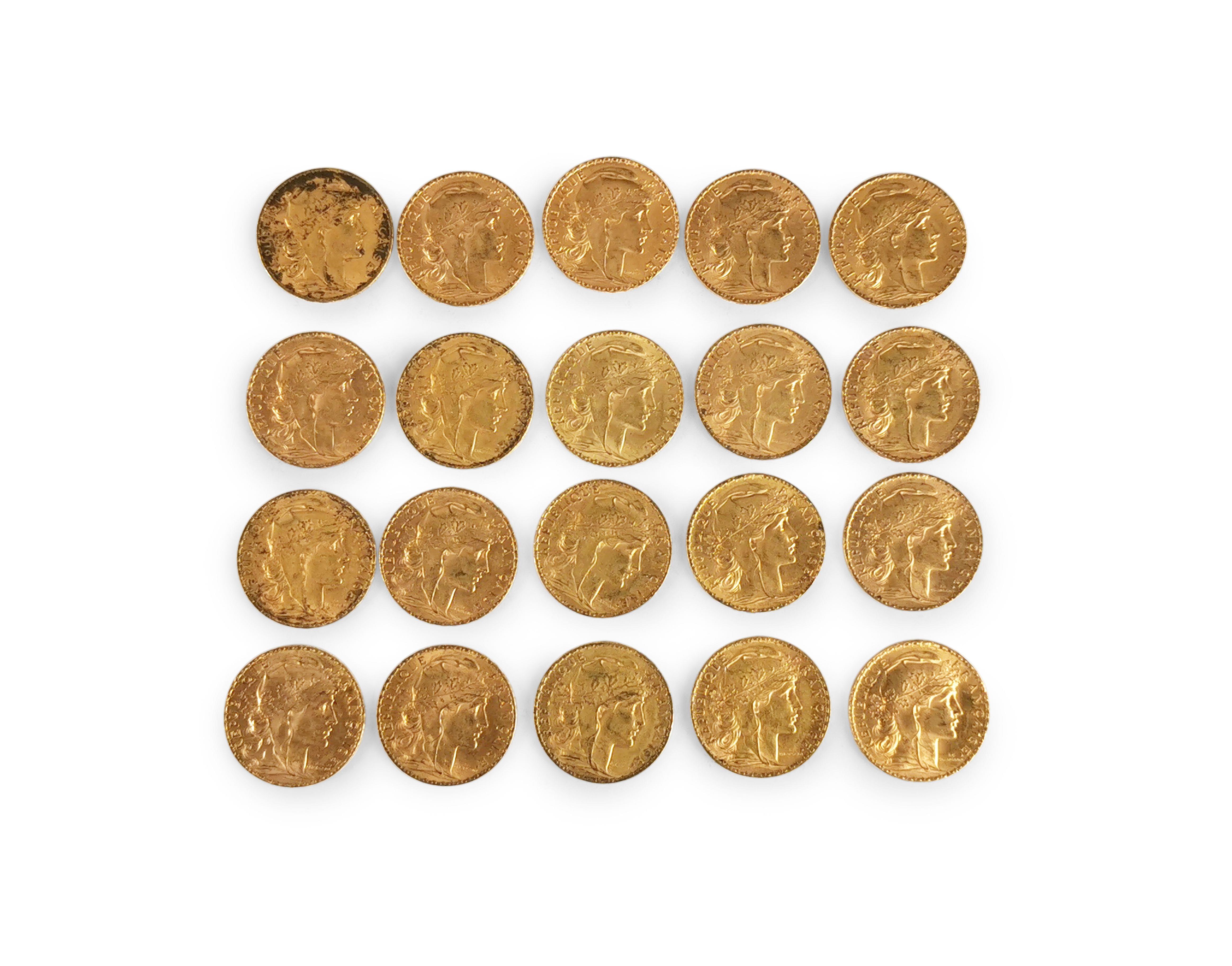 4384. Lot de vingt pièces de 20 francs Coq (Liberté, égalité, fraternité)