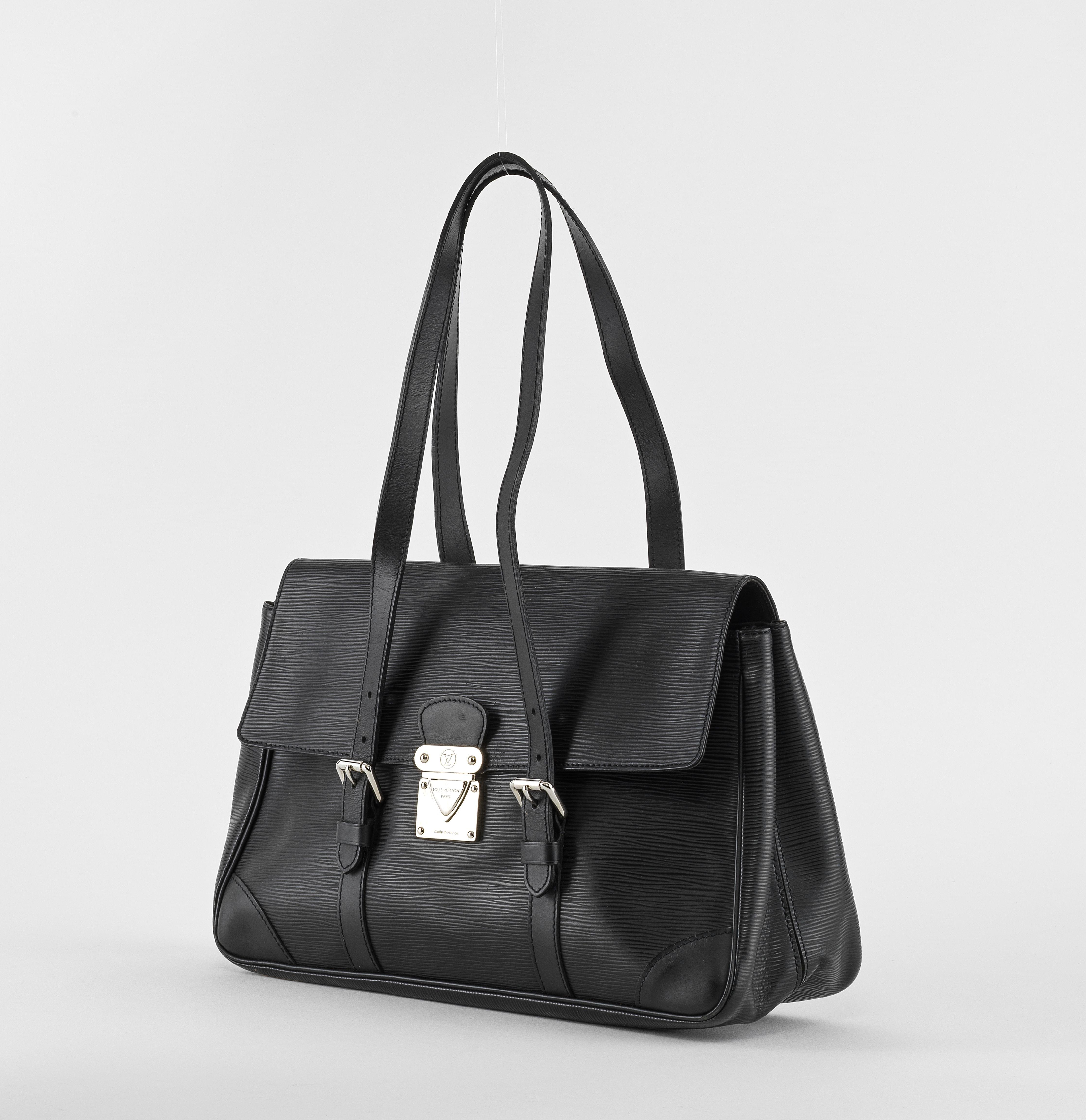 Cuir Epi noir, double poignée, fermeture sur rabat et bouton pression, 37x23x12 cm
