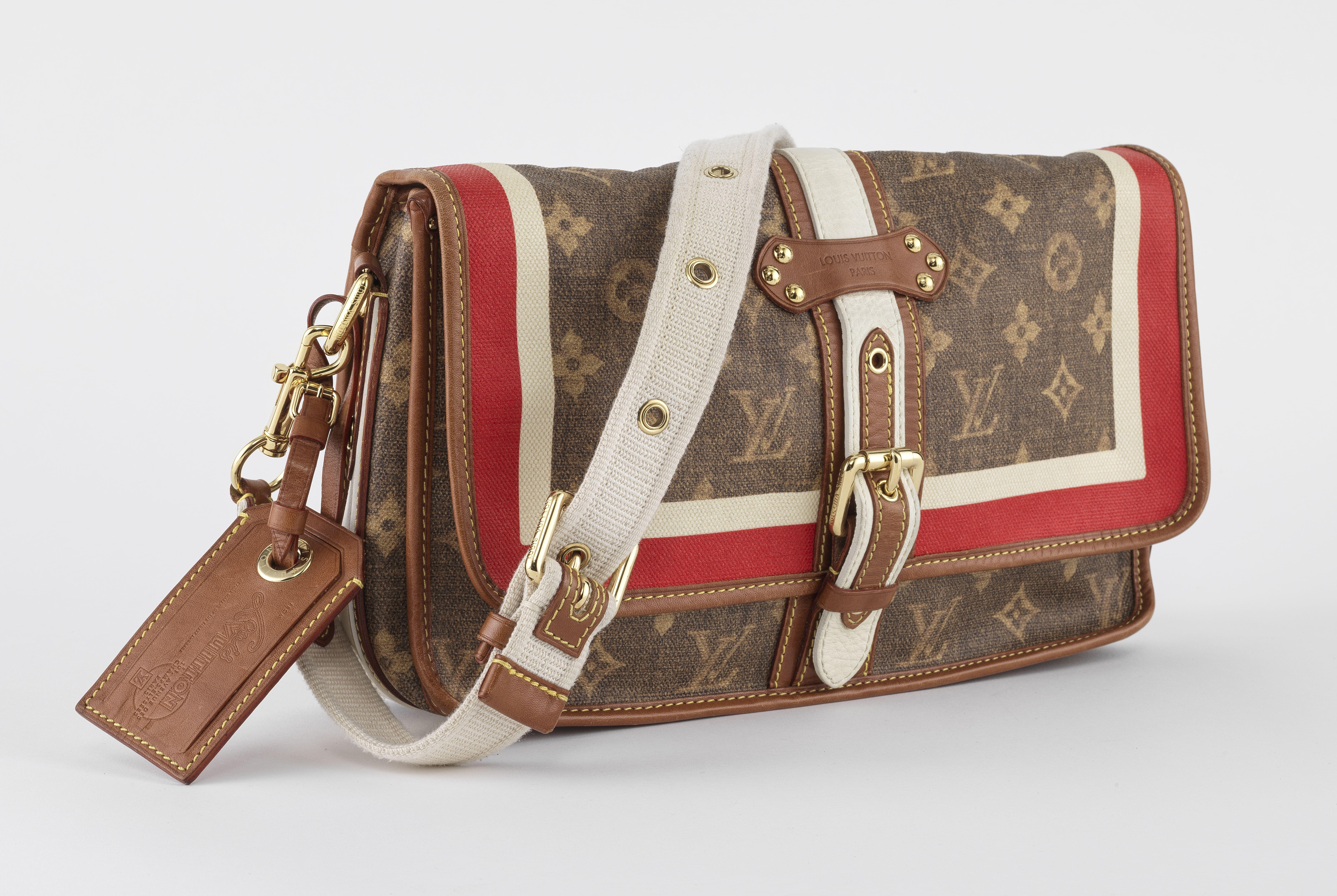 Toile Monogram avec garniture en cuir rouge et blanche, une poche arrière extérieure avec fermeture à pression, un piège en cuir plat amovible, un rabat avant avec fermeture à boucle, et poches intérieures, 32x18x9 cm