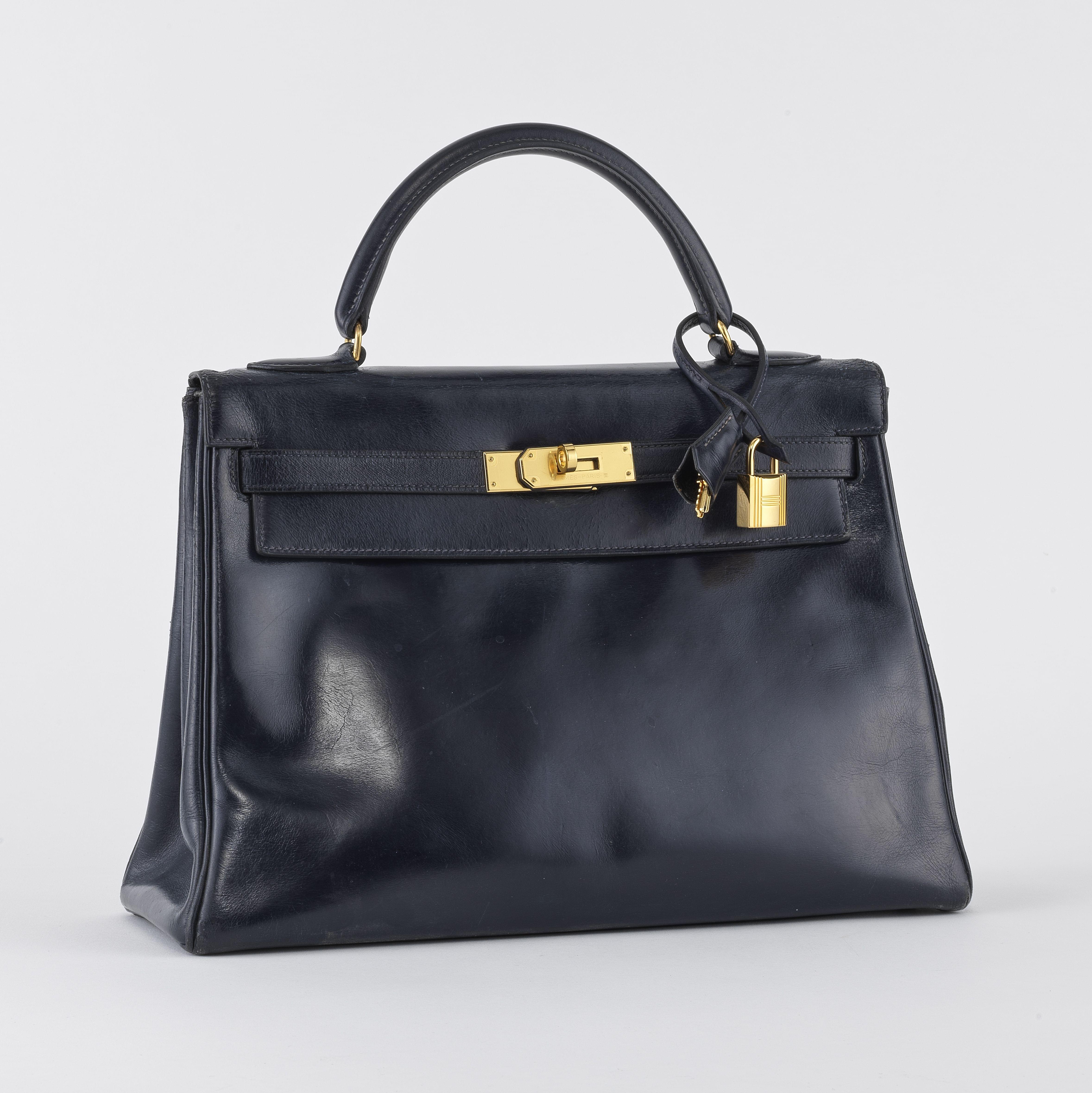 Cuir veau bleu marine, garniture dorée, intérieur en trois poches latérales en cuir de chèvre, cadenas, clefs, L 32x22x13 cm