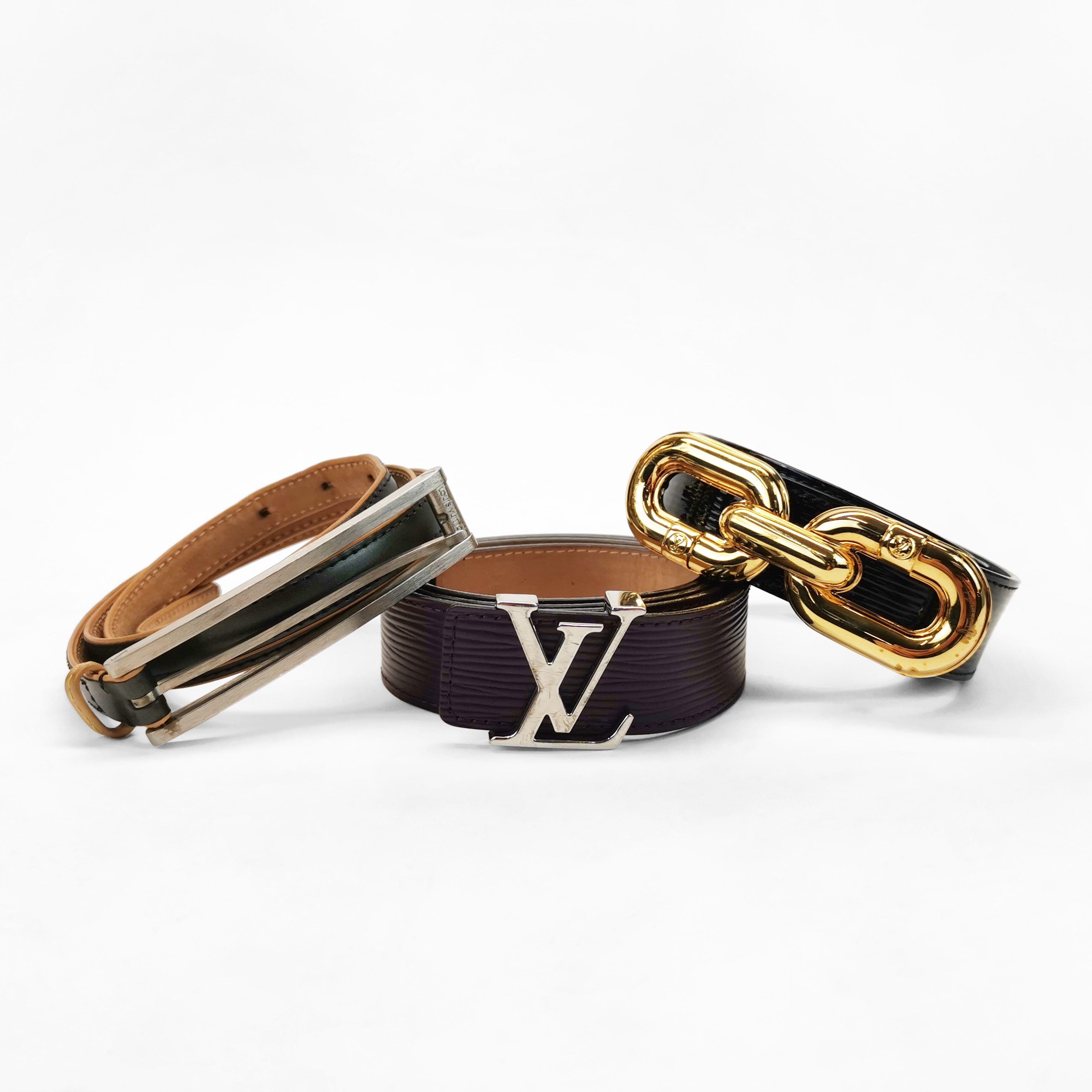 L'une en cuir Epi prune et boucle en métal argenté LV, T 90, une autre en cuir Epi noir à effet glacé et boucle en métal doré en forme de maillon de chaîne, T 90 et une dernière en cuir lisse anthracite et camel à effet glacé, L 99 cm
