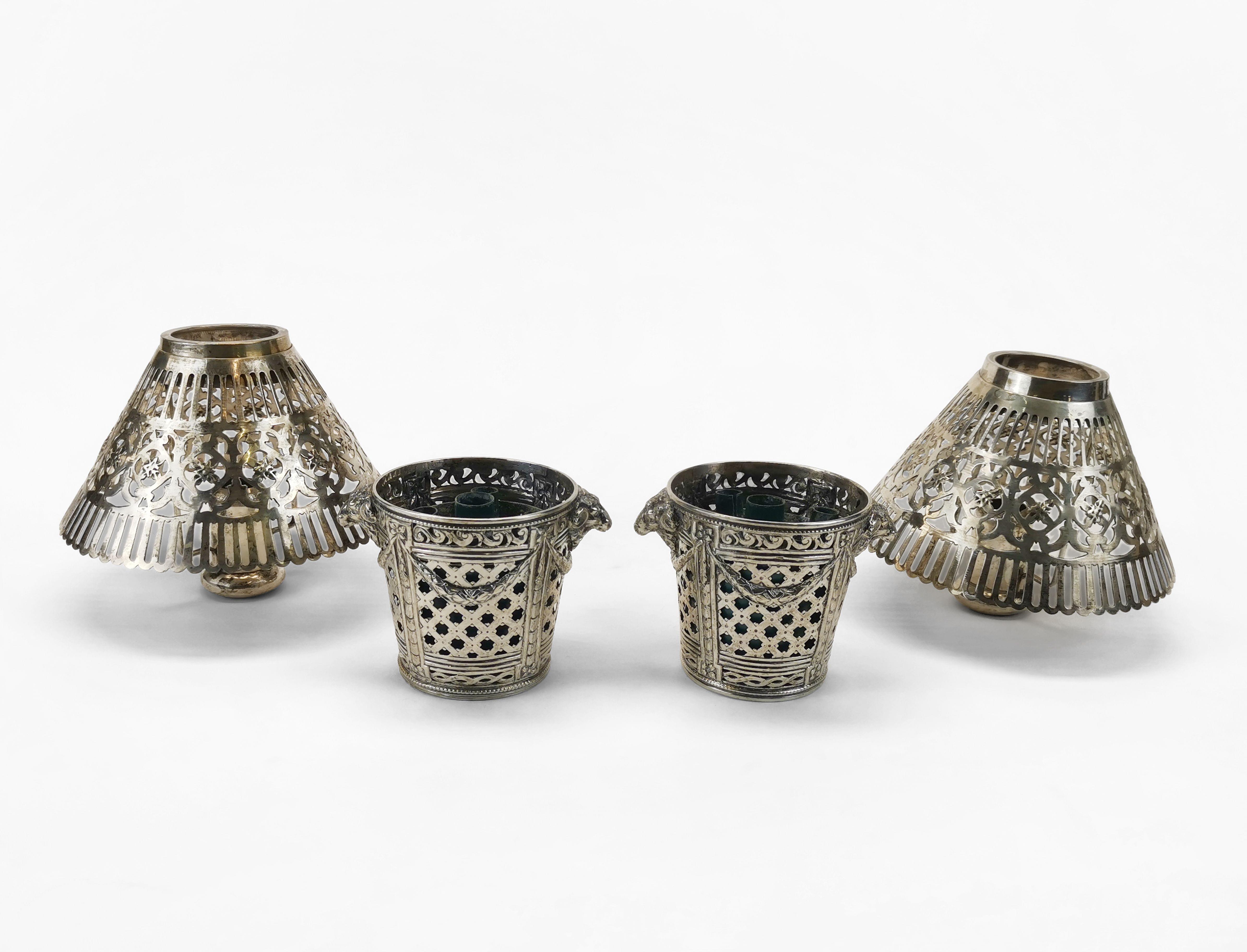 Hanau, argent 800, H 7 cm, 230g. On joint une paire d'abat-jour ajourés en métal argenté, D 14 cm.