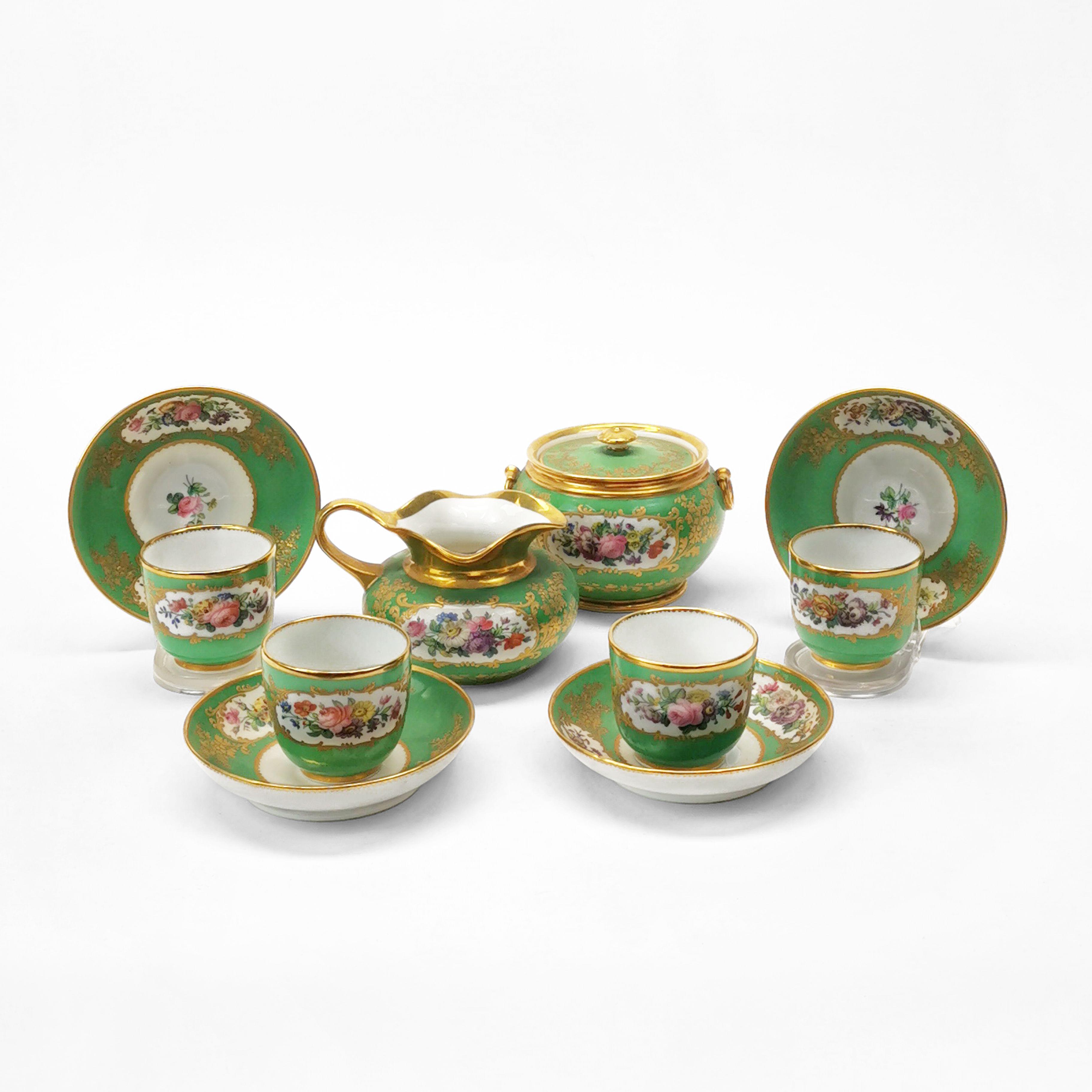 4598. Service à thé ou café d'époque Restauration vert émeraude et or à motif de fleurs polychromes en réserves