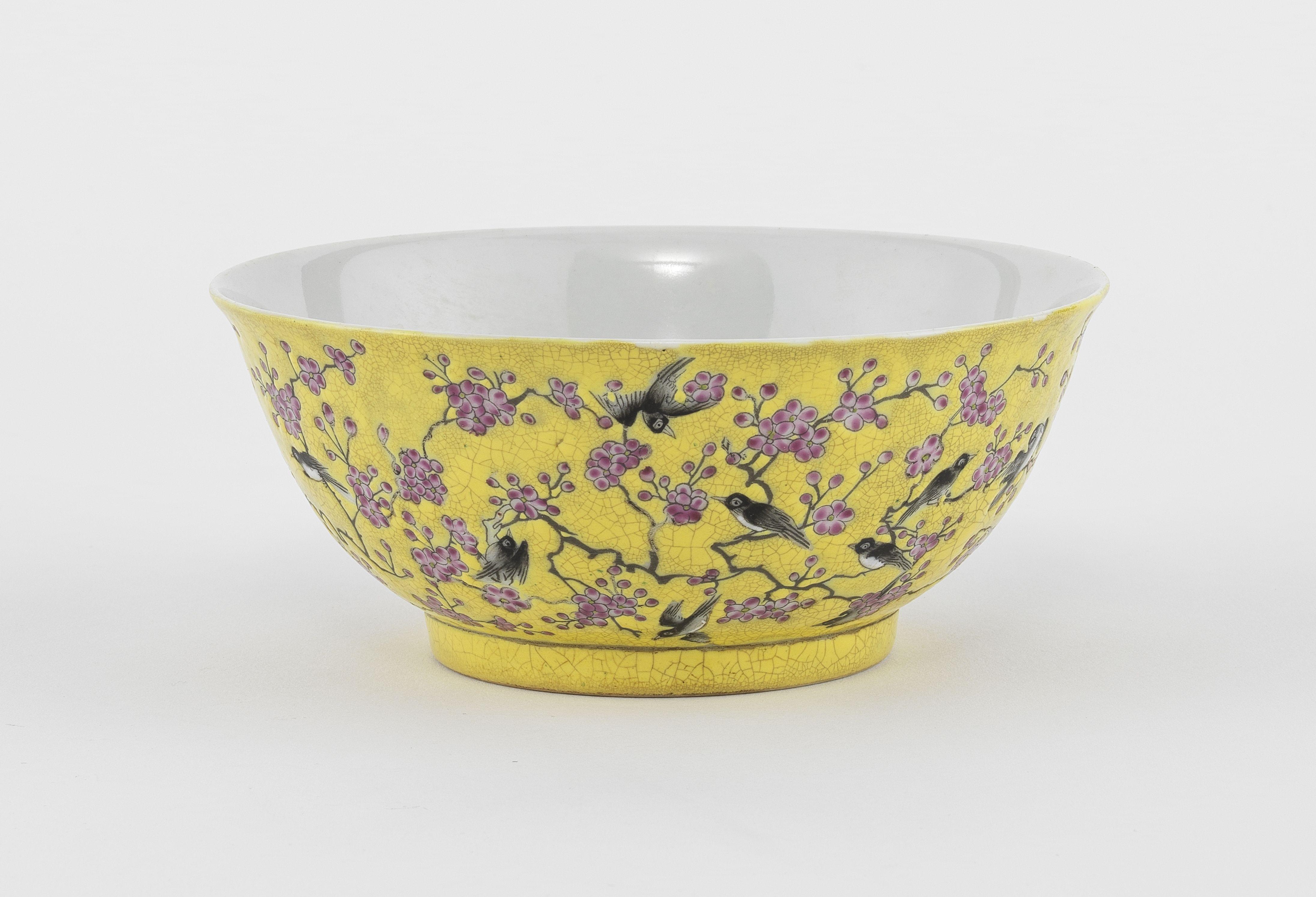Porcelaine polychrome à décor d'oiseaux et branches de cerisier sur fond jaune, D 14 cm