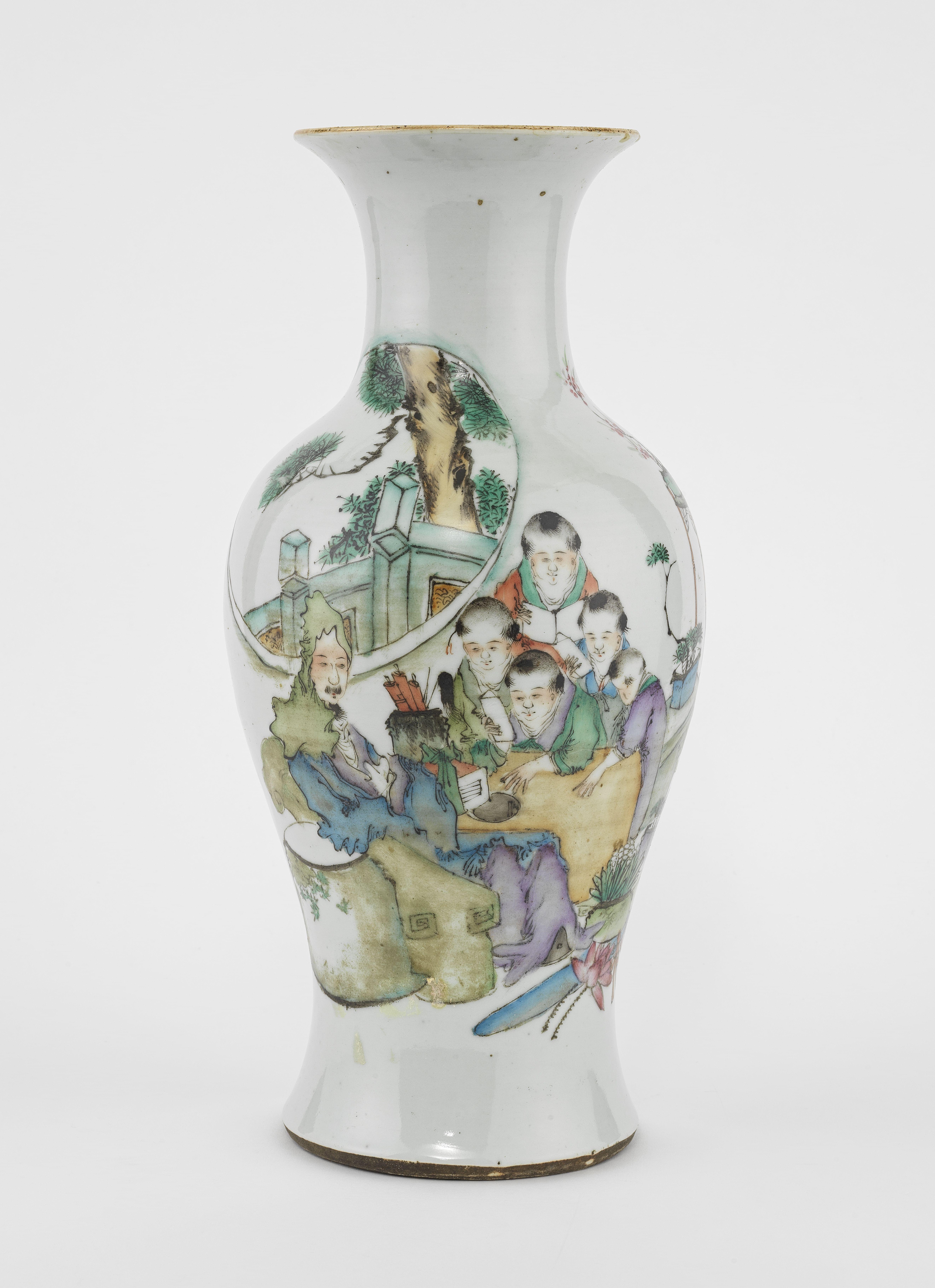 Porcelaine émaillée polychrome à motifs d'un maître enseignant à ses élèves et d'un poème, H 41 cm