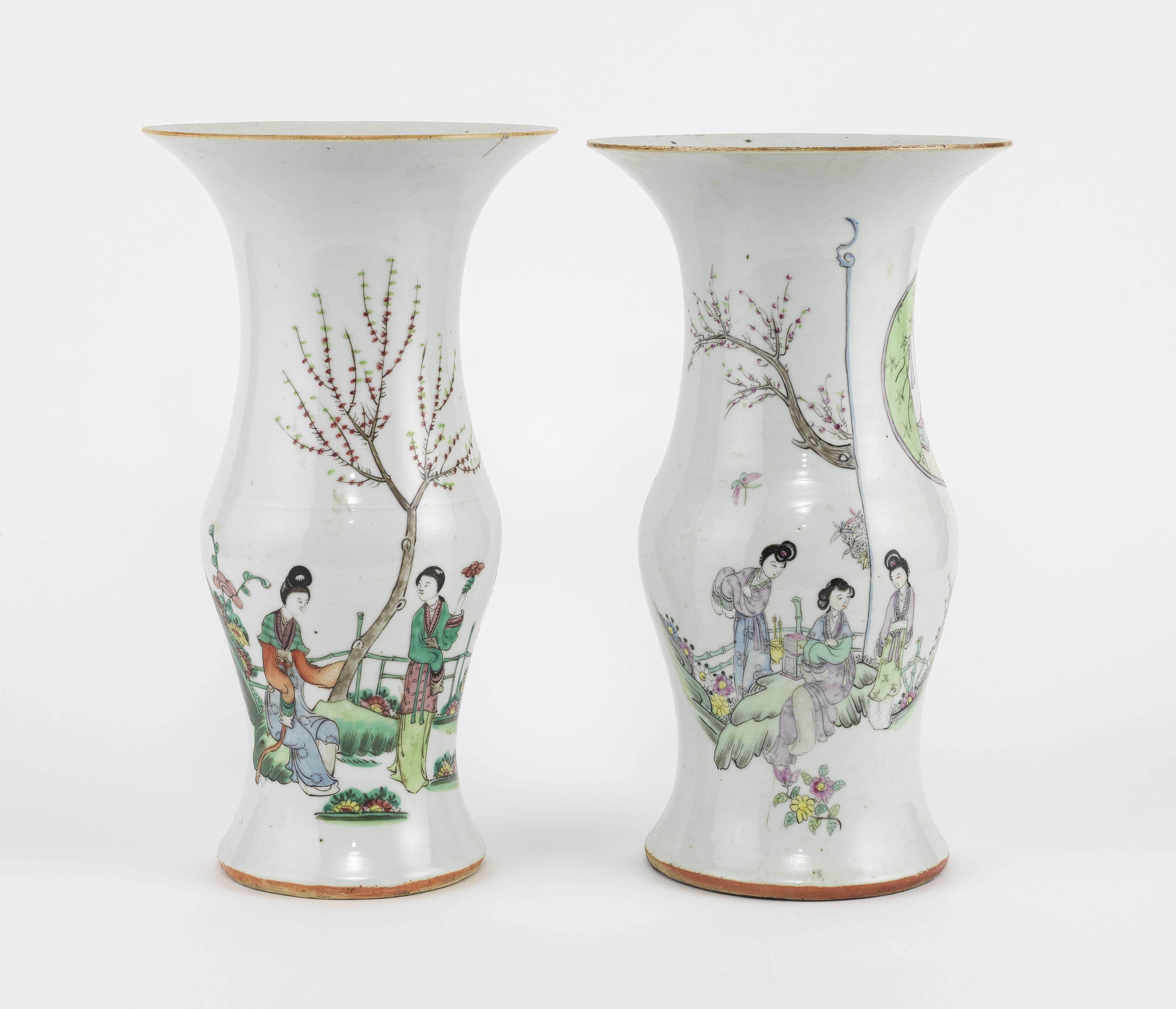 Porcelaine émaillée polychrome à décor de personnages et cerisiers, H 34 cm