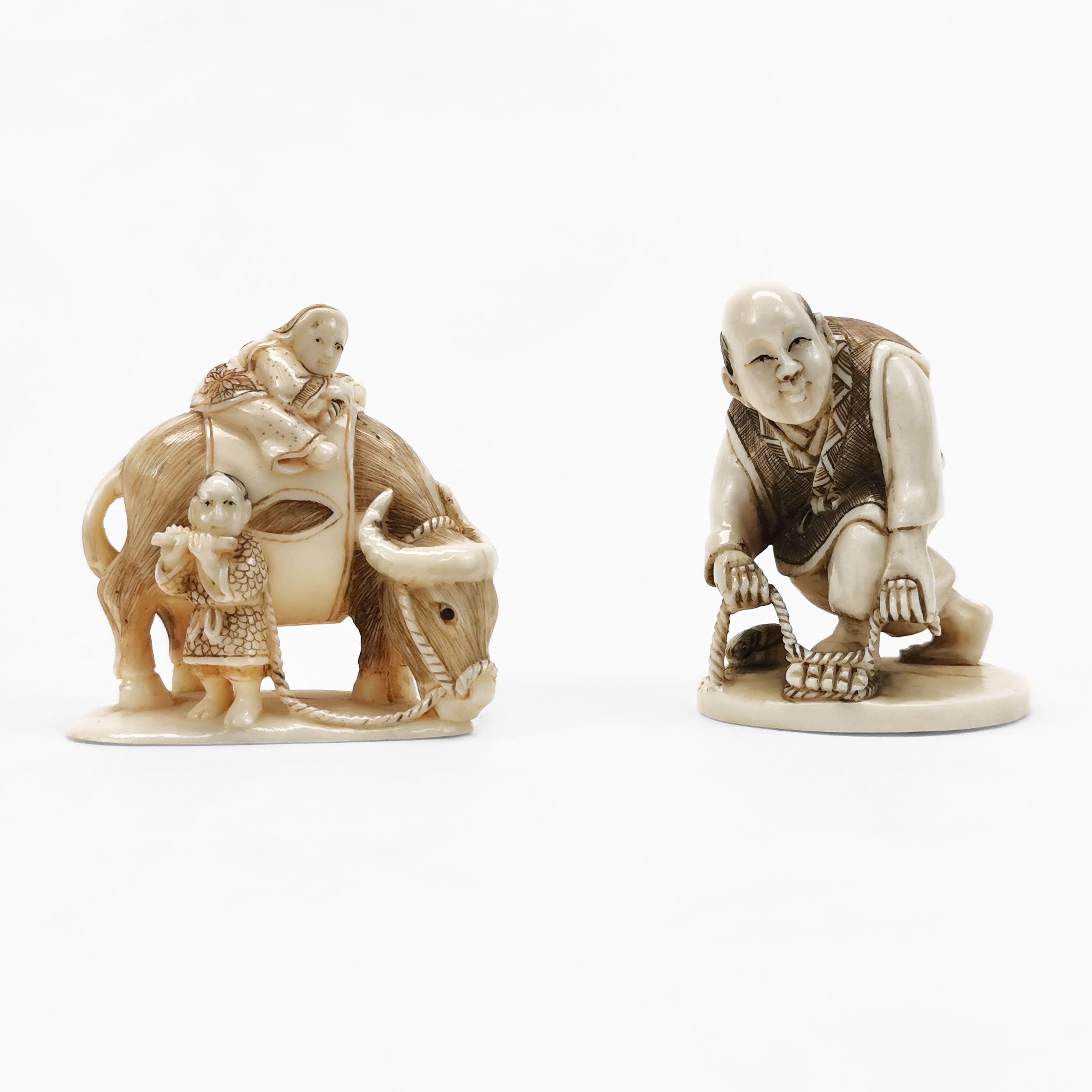 4827. Deux okimonos, l’un figurant un buffle et enfants, l’autre figurant un personnage à la sandale, Japon début XXe s