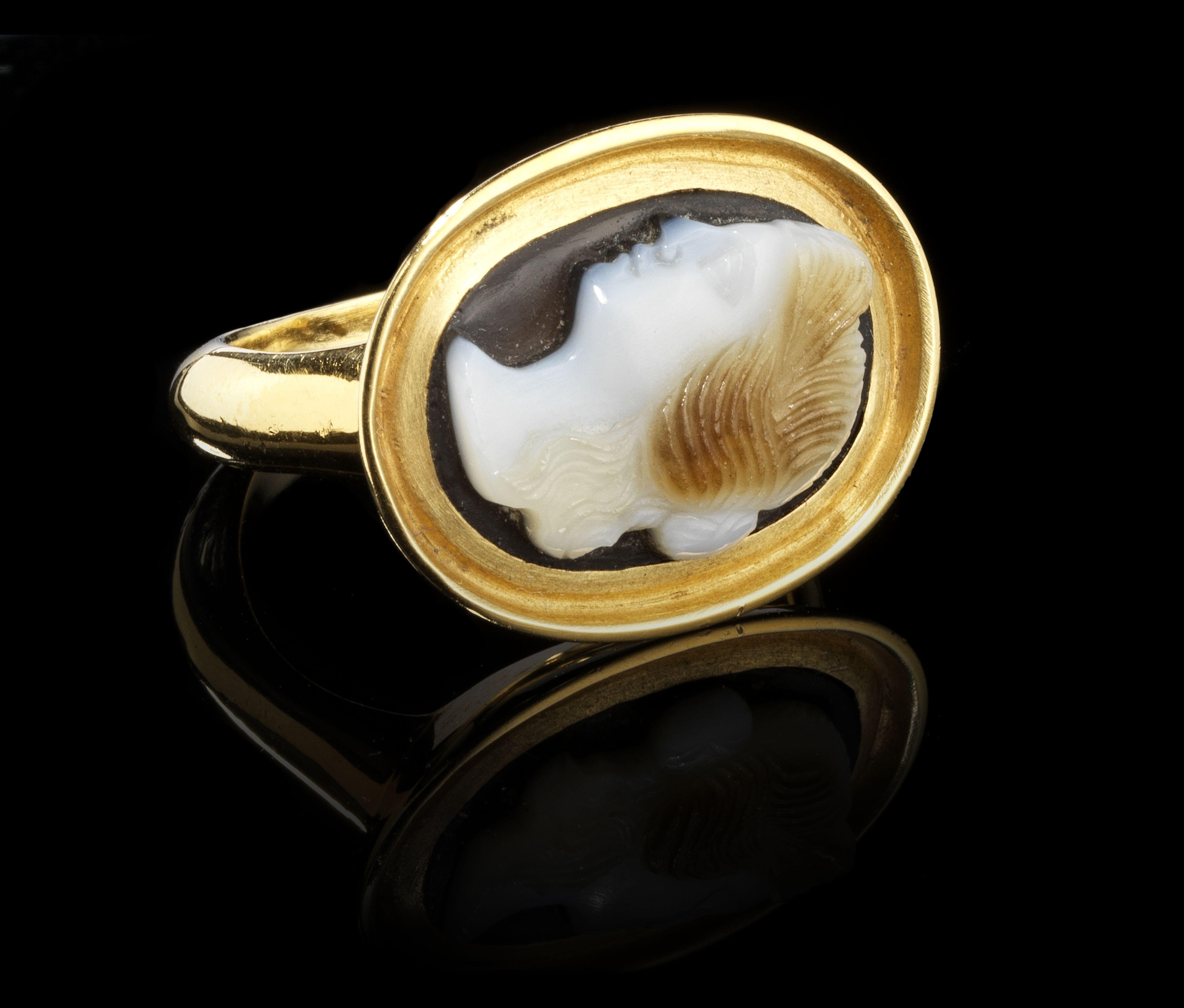 4942. Bague sertie d'un camée sur calcédoine à décor de profil de femme