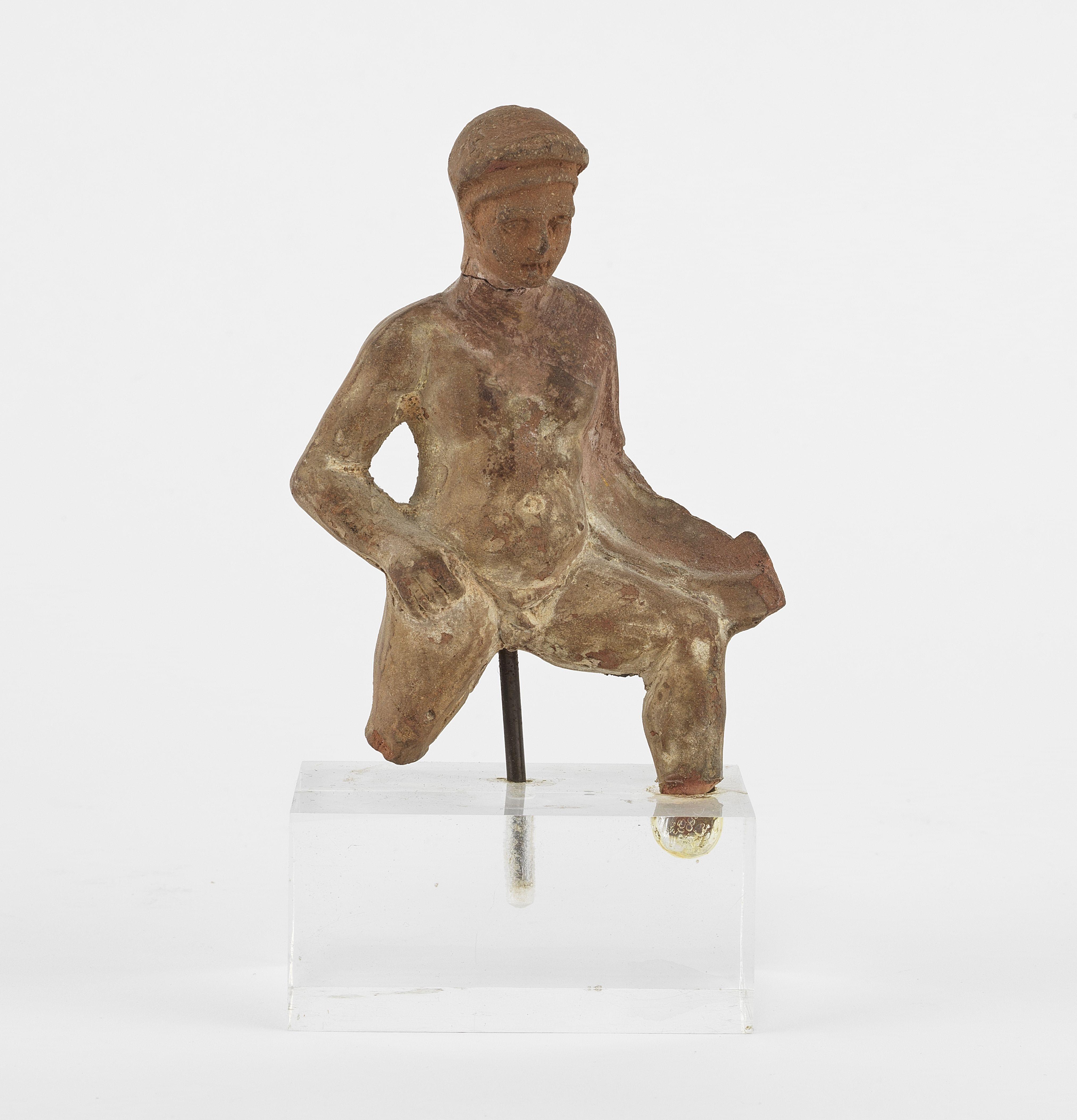 Représentation d’un homme en pleine course. Il est nu et tient contre son flanc gauche un bouclier. Il s’agit probablement d’un athlète participant à la discipline olympique dite « course en arme ». Le coureur porte un casque conique de type pilos et il avait une lance dans la main droite. Cette lance, en métal, passait dans le trou pratiqué dans la main, terre cuite, H 10,5 cm