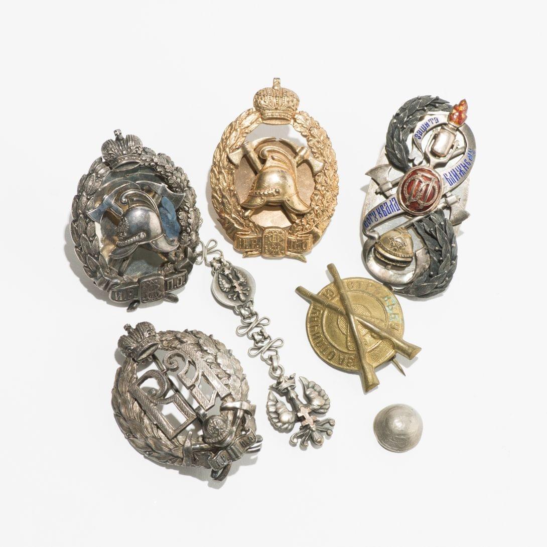 3563. 5 insignes russes de pompier et une chaîne à décor d'une aigle