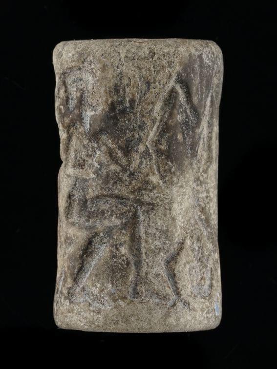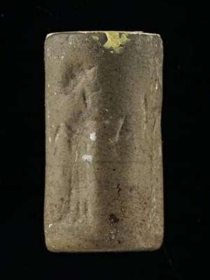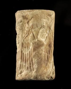 (1 et 3) Une scène de présentation à une divinité, (2) sur deux registres: une divinité vêtue de la kaunakes et du dieu serpent de part et d'autre un autel et croisillons, (4) une divinité sur une divinité-bateau tenant une rame à la main, (5) une scène probablement de bataille figurant un archer, deux hommes debout et l'un renversé, 33x19 mm, 38x17 mm, 23x12 mm, 30x18 mm, 29x18 mm. Les scènes de présentation si fréquentes pendant la période d'Ur III sont présentes dès l'époque akkadienne illustré par le sceau 92 de la collection Chiha, Doumet, Claude op. cit.