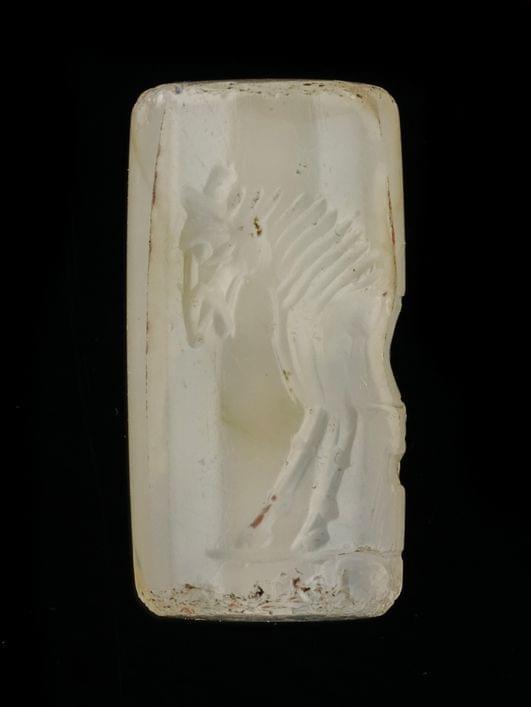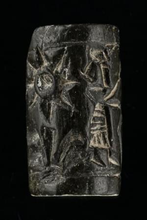 (1) un archer et une prêtresse éventant un feu sur un autel, à côté un arbre de Vie, (2) des génies ailés (3) un personnage et Oannès de part et d'autre d'un arbre de vie surmonté du disque solaire ailé, à côté un kuduru, symboles de Marduk et Nabu, dans le champ le disque ailé (4) des figures ailées affrontées, (5) une jument têtée par son poulain, 20x11 mm, 23x11 mm, 22x11 mm, 23x12 mm