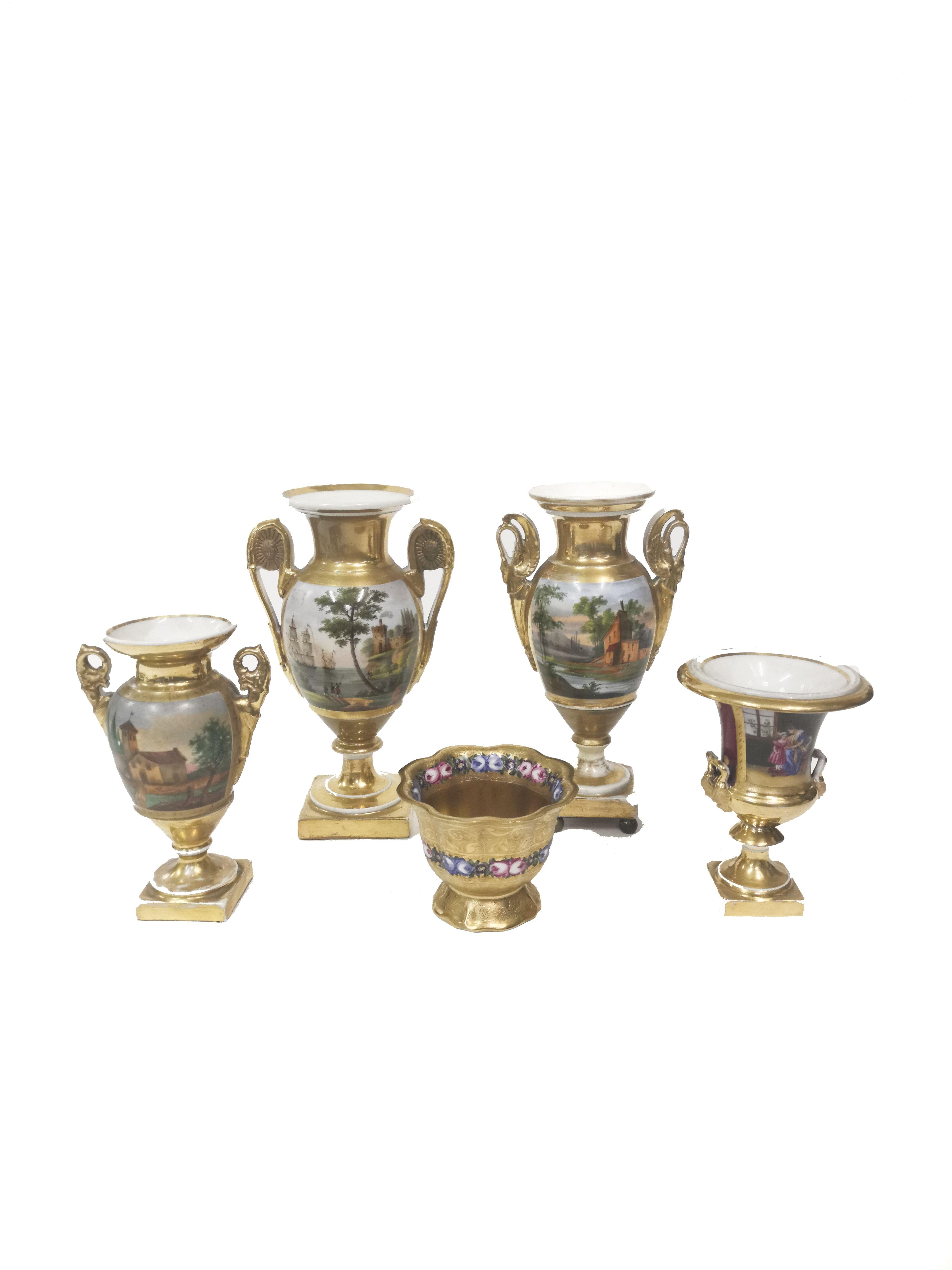 3892. 5 vases de style Empire à décor de scènes galantes, paysages et fleurs