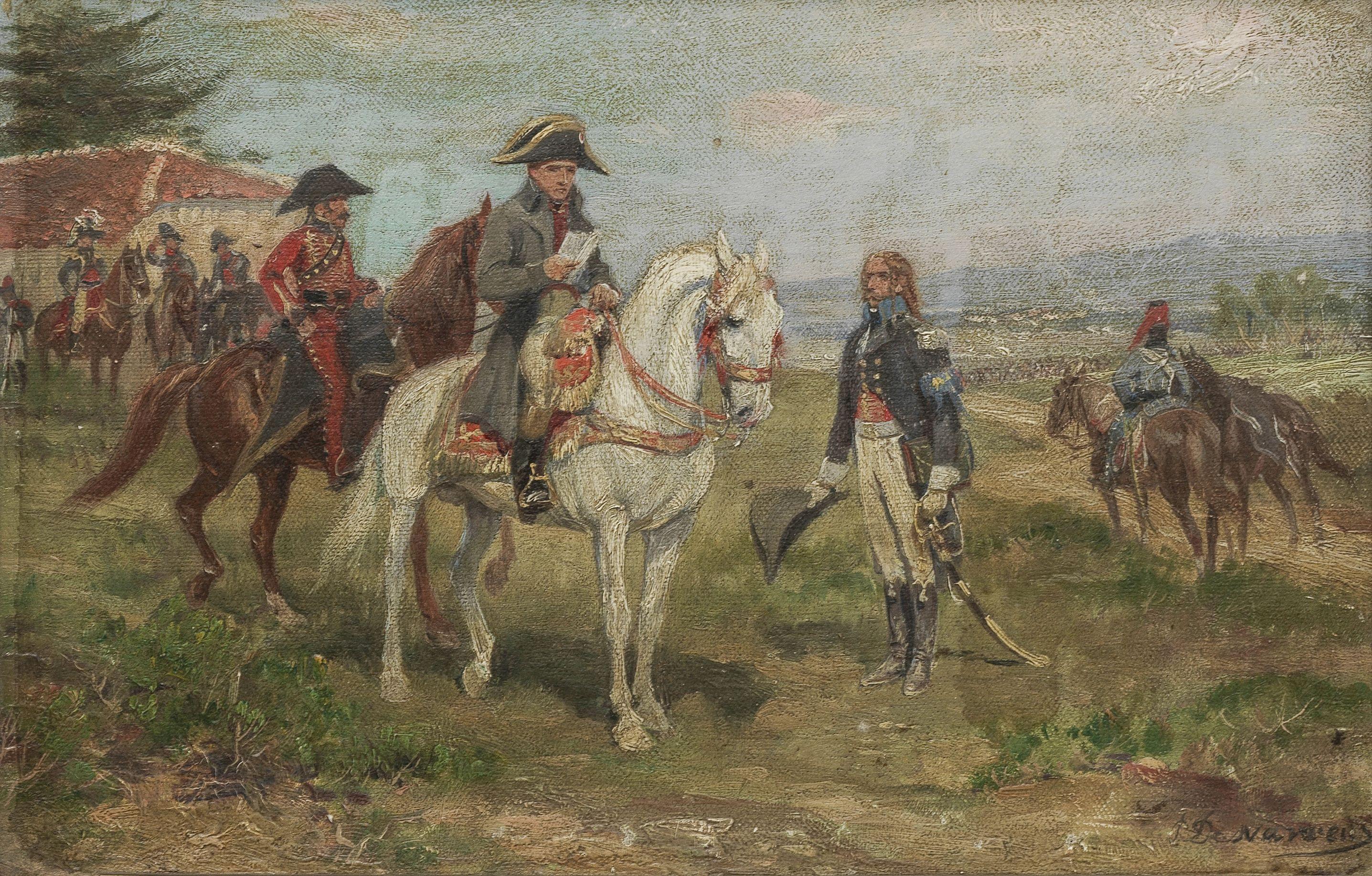 Napoléon sur le champ de bataille, huile sur toile, signature illisible, 27x32 cm