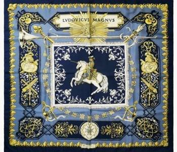 A décor de Louis XIV au centre, sur fond et bordure bleus, soie,...