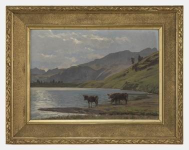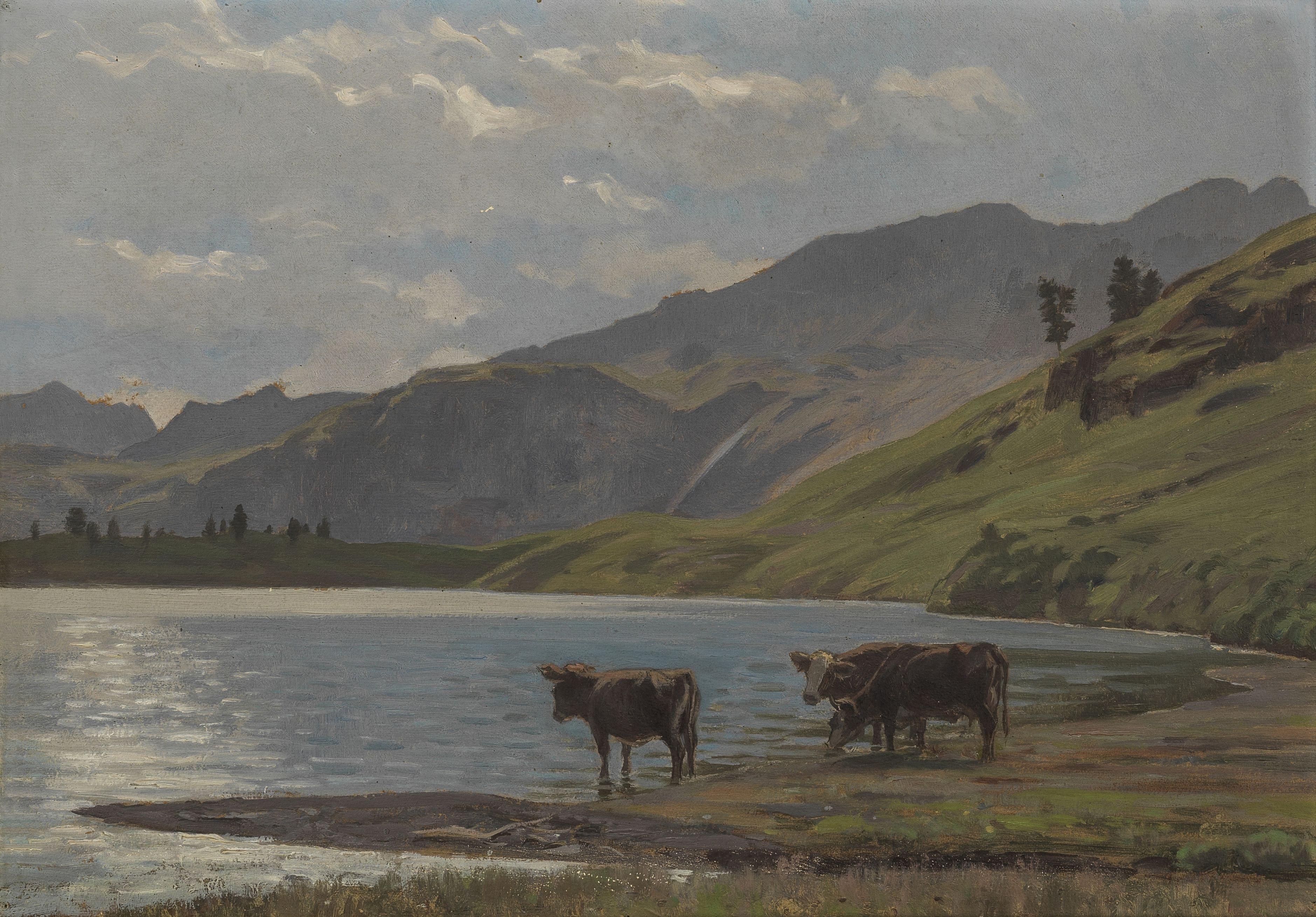 Paysage animé de vaches, huile sur carton marouflée sur toile, cachets de la succession de l'artiste au dos, 38x53 cm