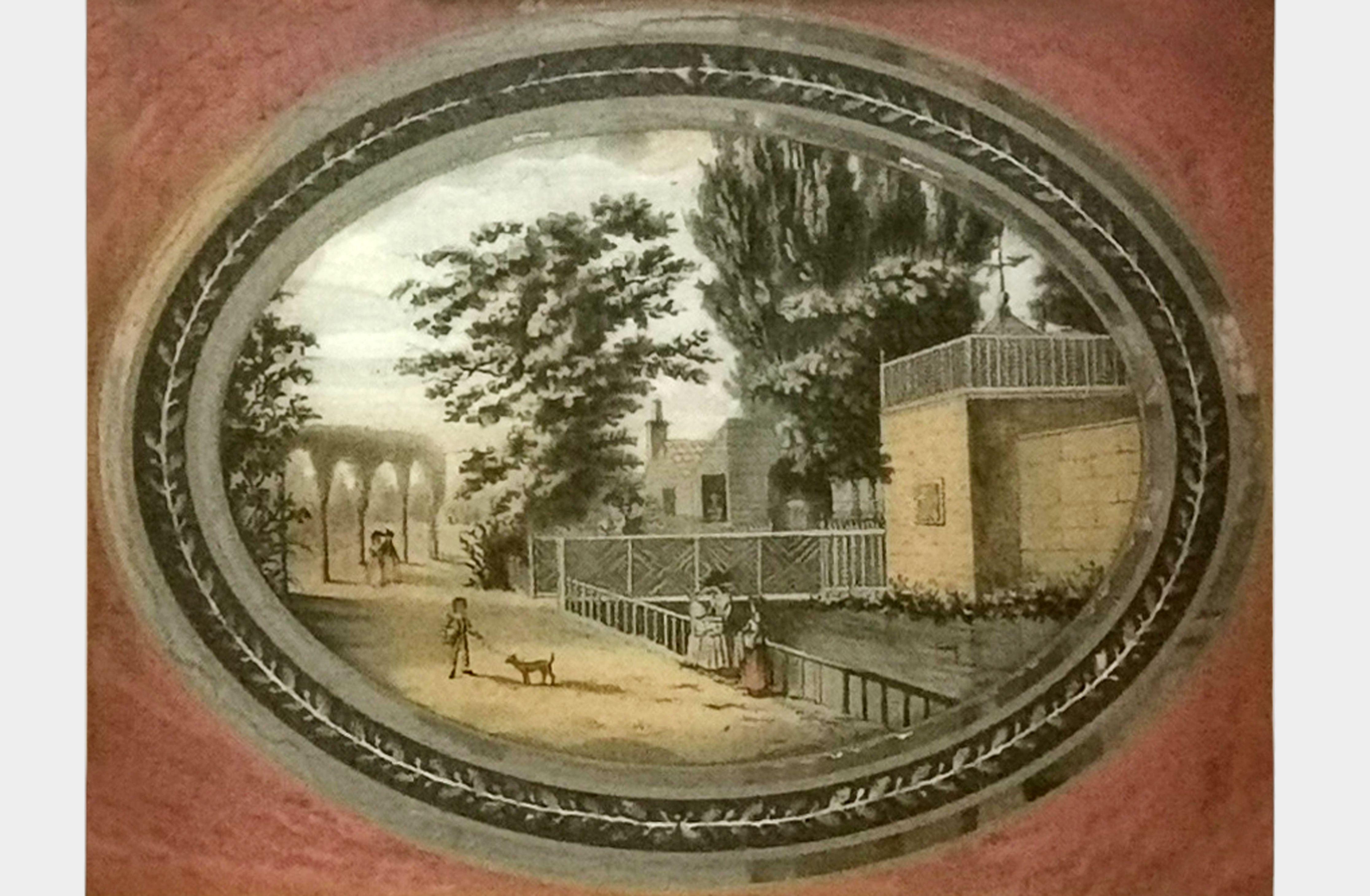 Vue d'un jardin animé, peinture sous-verre, 17x23 cm