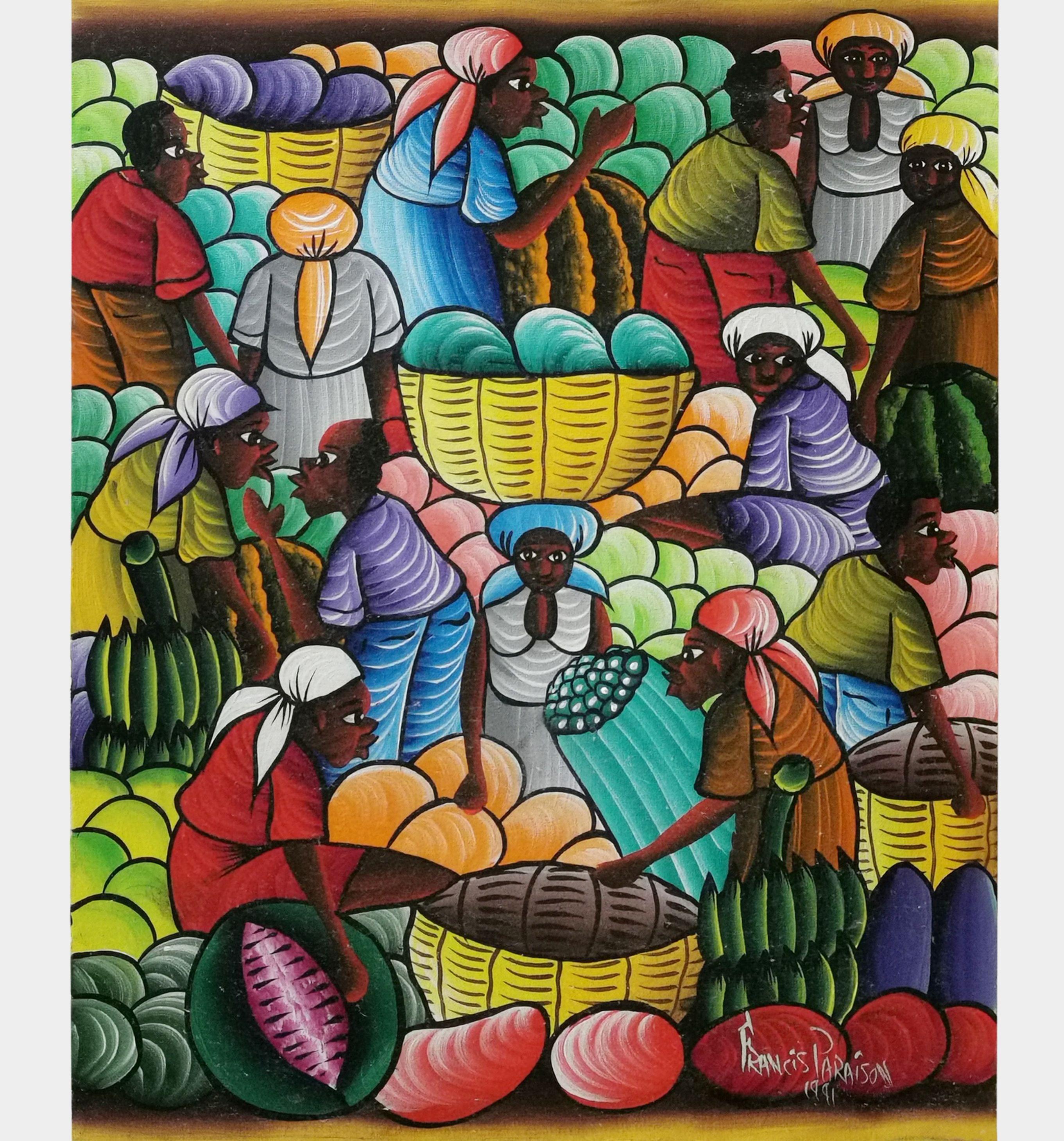 Scène de marché, acrylique sur toile, signée et datée 1991 au dos, 40x50 cm