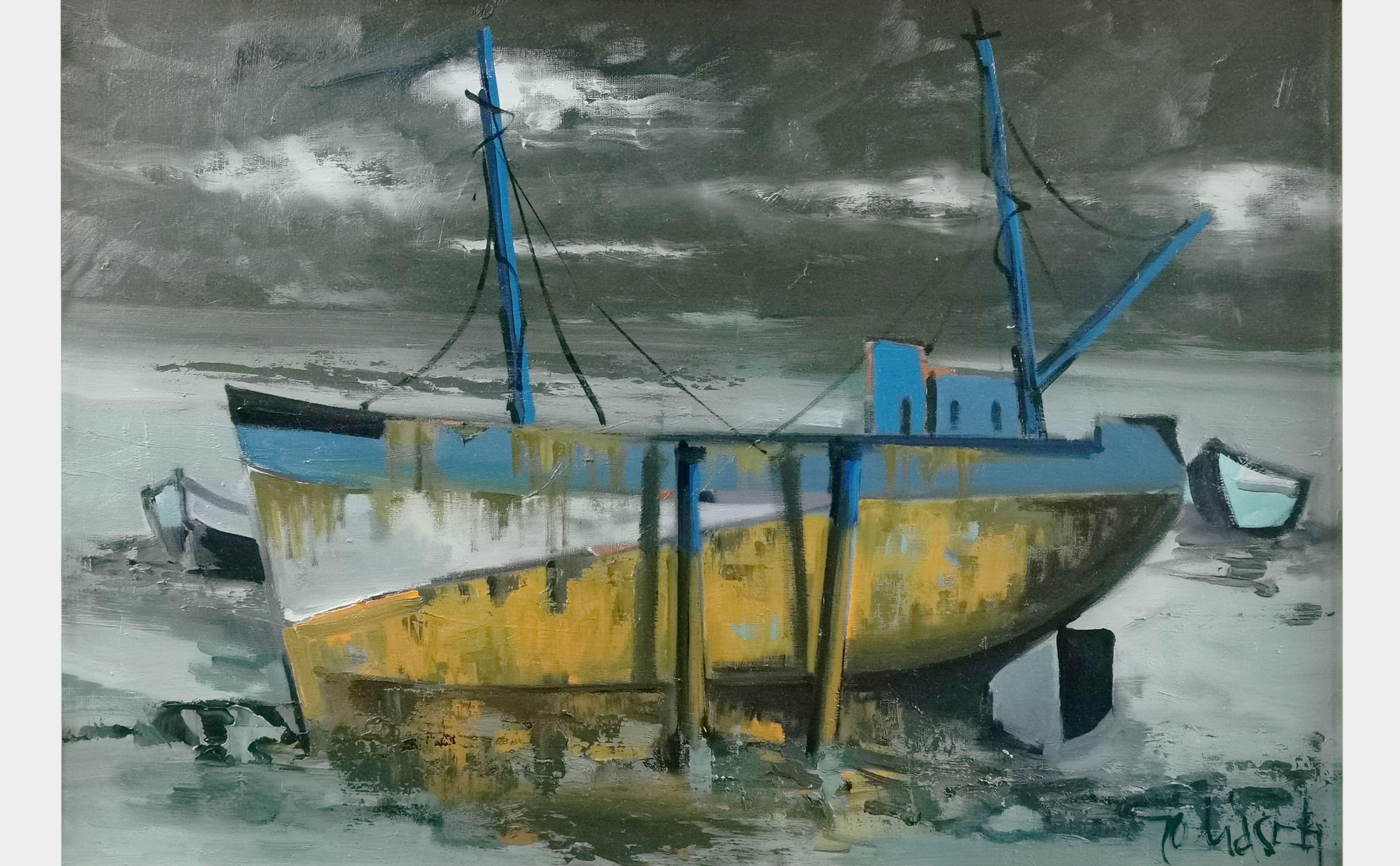 Bateau à sec, huile sur toile, signée, 50x70 cm