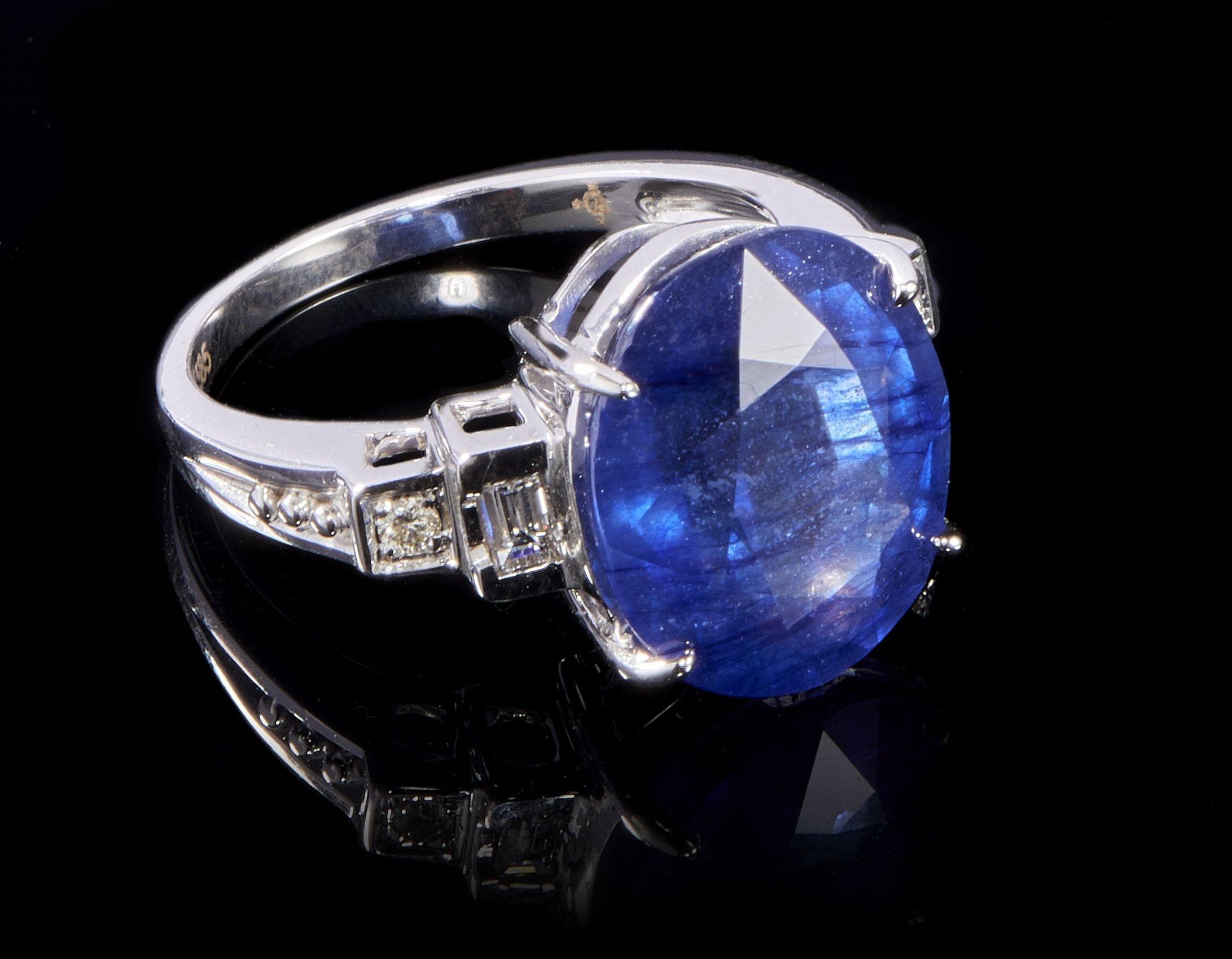 118. 5320*Bague sertie d'un saphir taille ovale (env. 9,5 ct) épaulé de diamants taille baguette et taille brillant