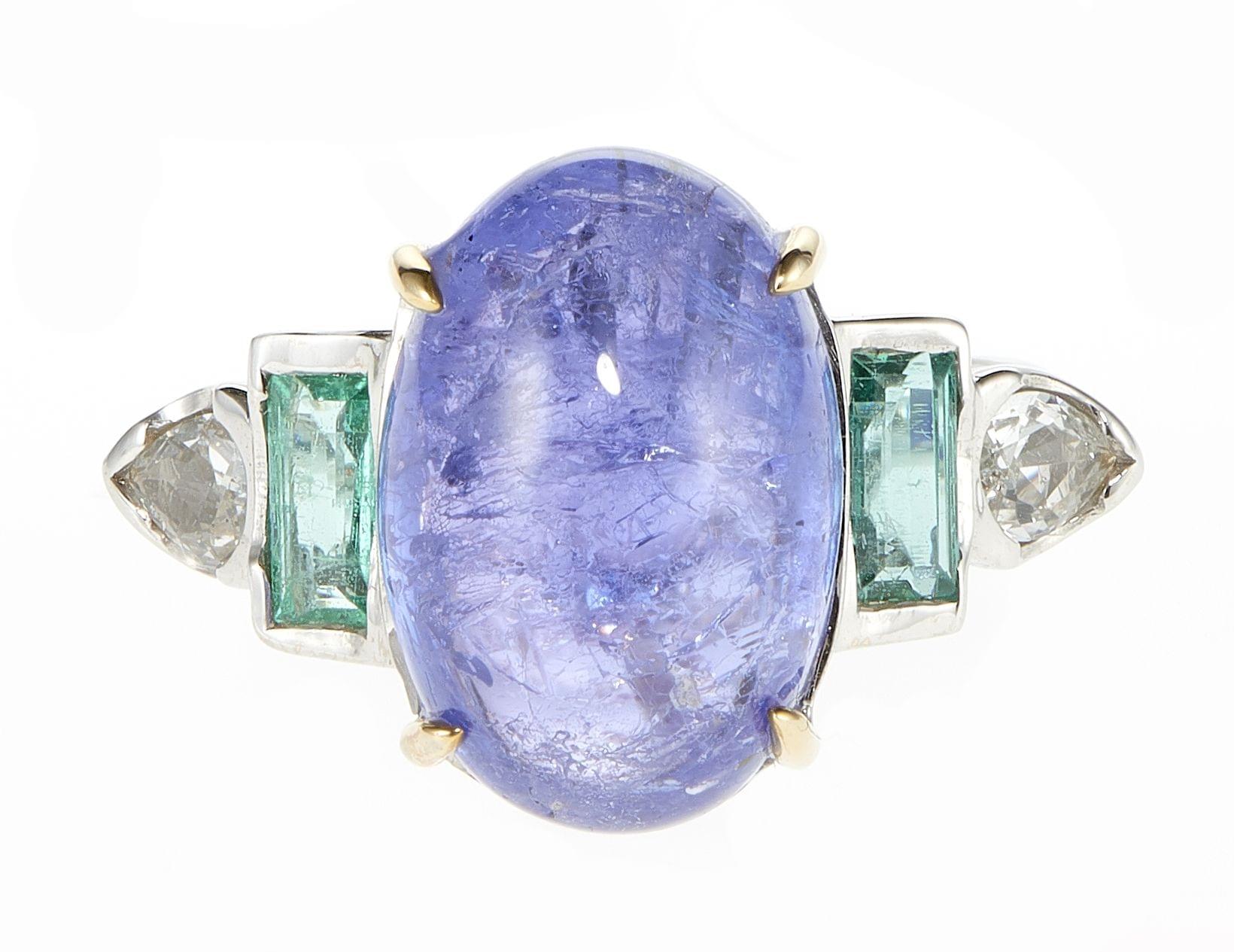 4309. 5331 -*Bague sertie d'une tanzanite taille cabochon (env. 11 ct) épaulée d'émeraudes et de saphirs blancs taille poire