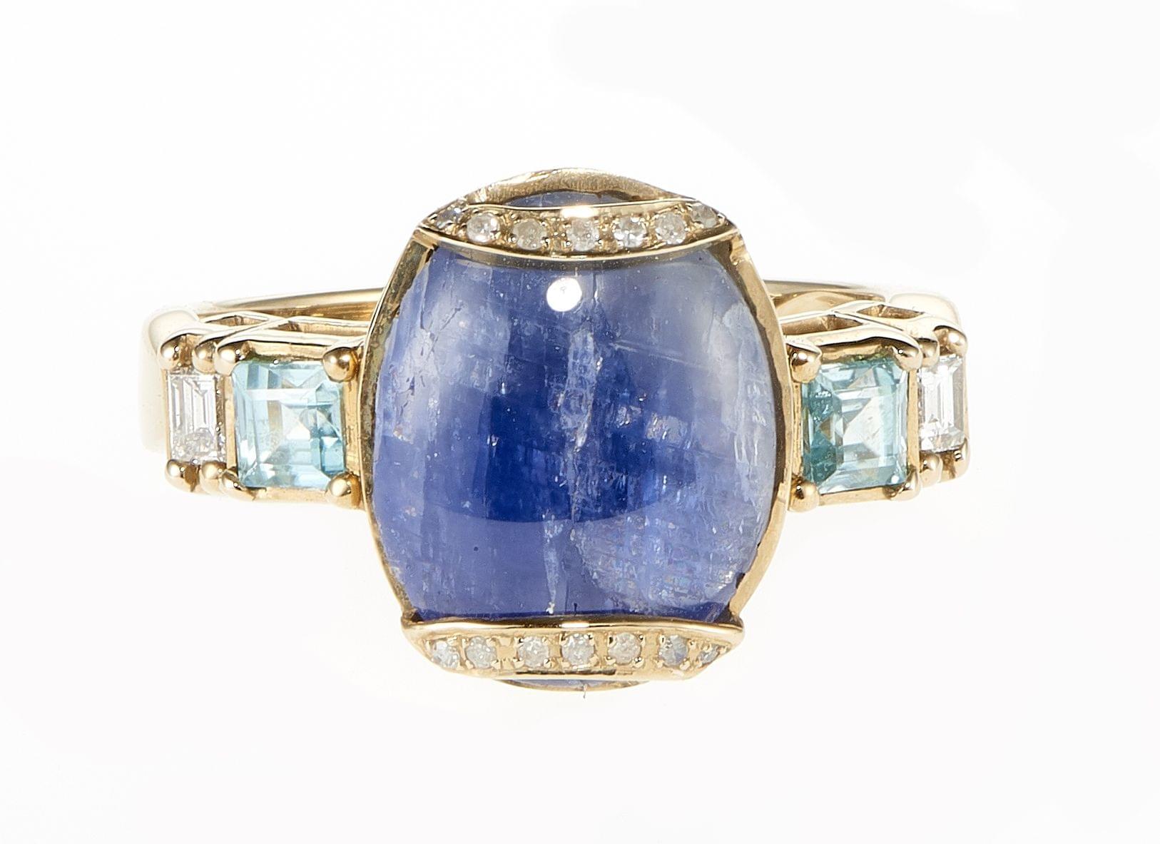 4308. 5350 -*Bague centrée d'un saphir birman non chauffé taille cabochon ovale (env. 3,9 ct) épaulé de topazes bleues et de diamants