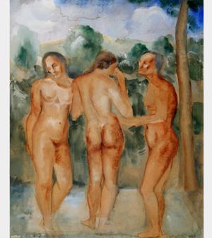 Les Trois Grâces, aquarelle sur papier, signée, au dos deux études de visage au crayon gras,45x36 cm