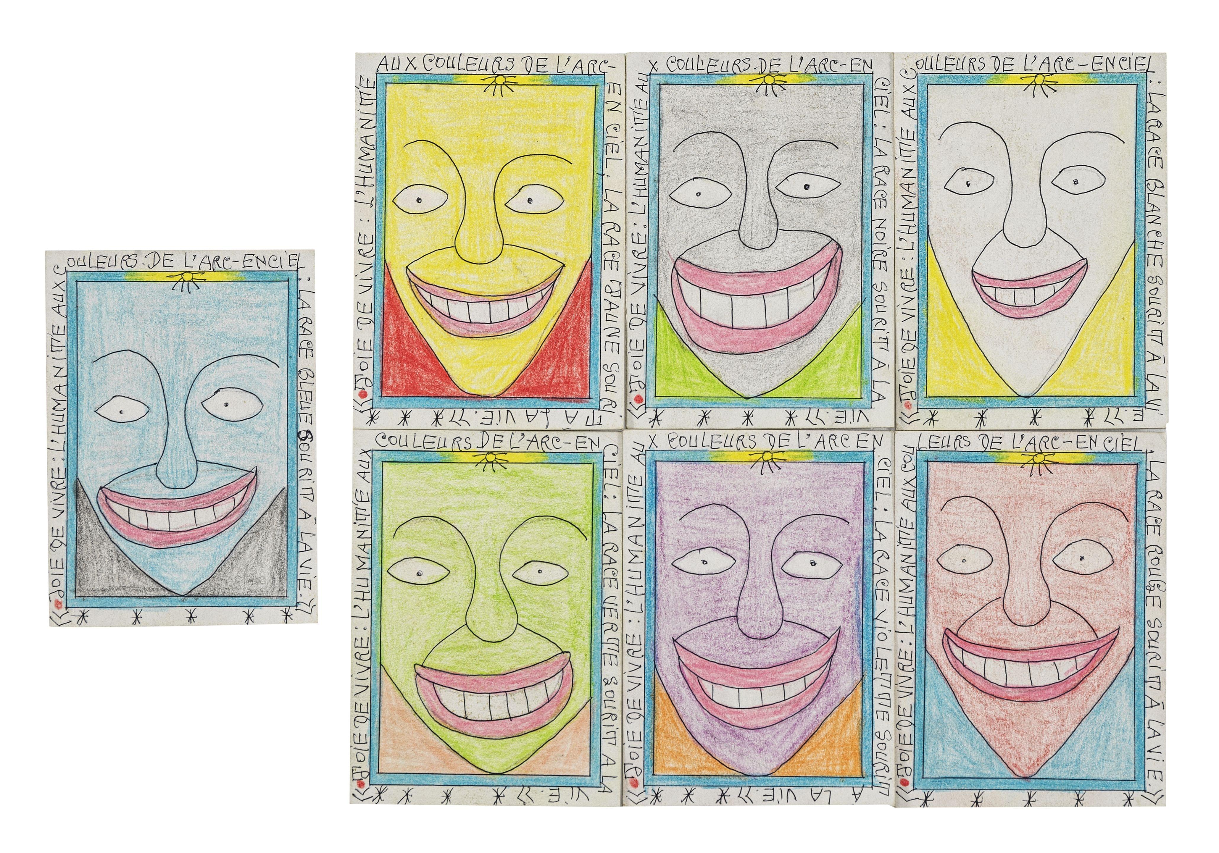 Joie de vivre: L'Humanité aux couleurs de l'arc-en-ciel: La race bleue/jaune/noire/blanche/verte/violette/rouge sourit à la vie, série de 7 dessins, stylo bille et crayons sur carton, chacun signé et daté au dos 4 décembre 2008 18x13 cm.Provenance: famille de l'artiste