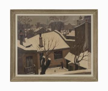 Village en hiver avec des enfants sur une luge, huile sur pannea...
