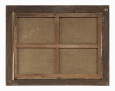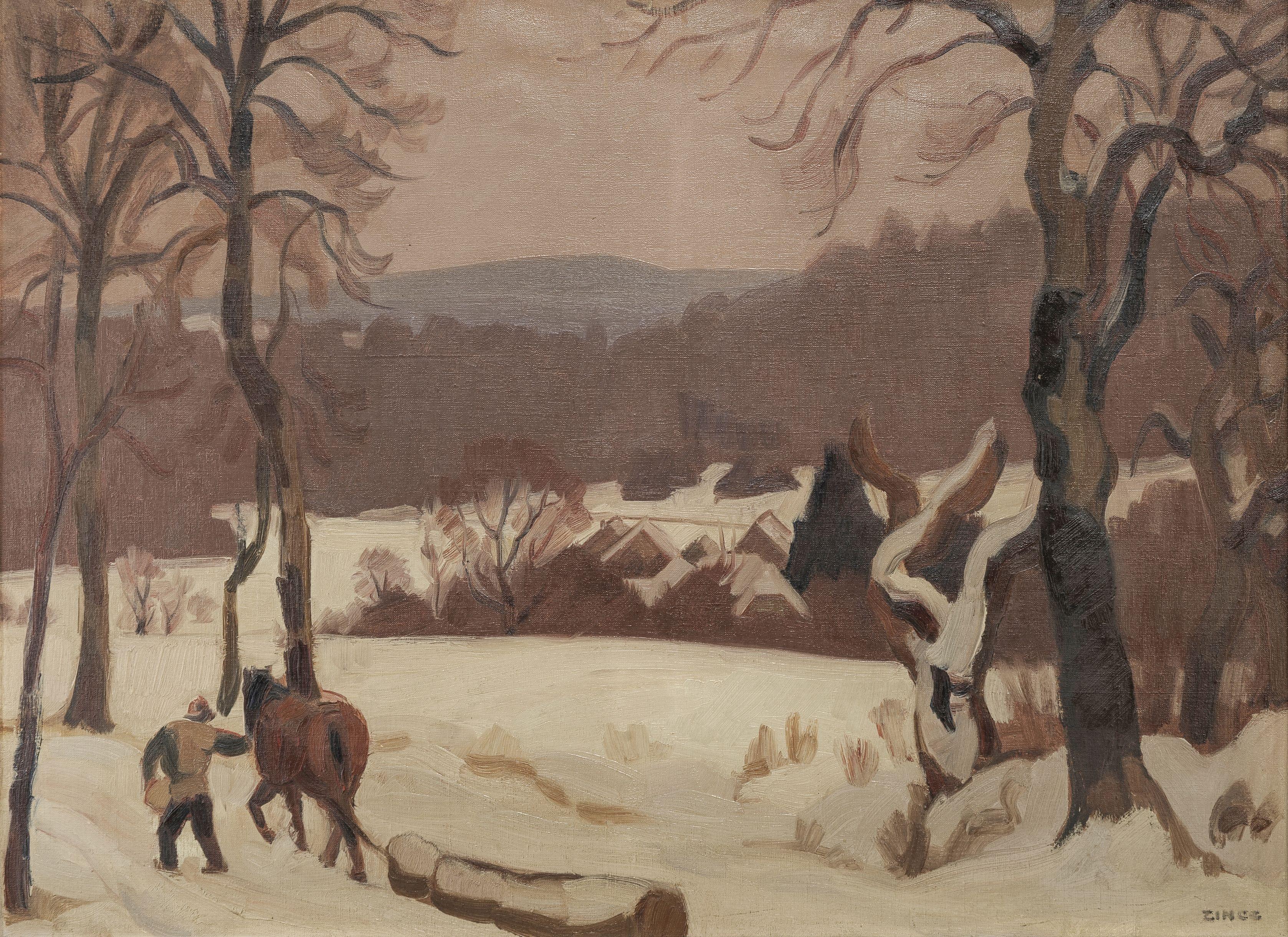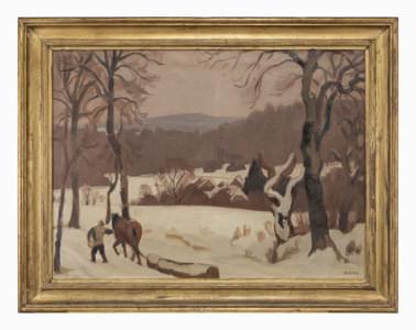 Chariot à l'entrée du village sous la neige, huile sur toile, si...