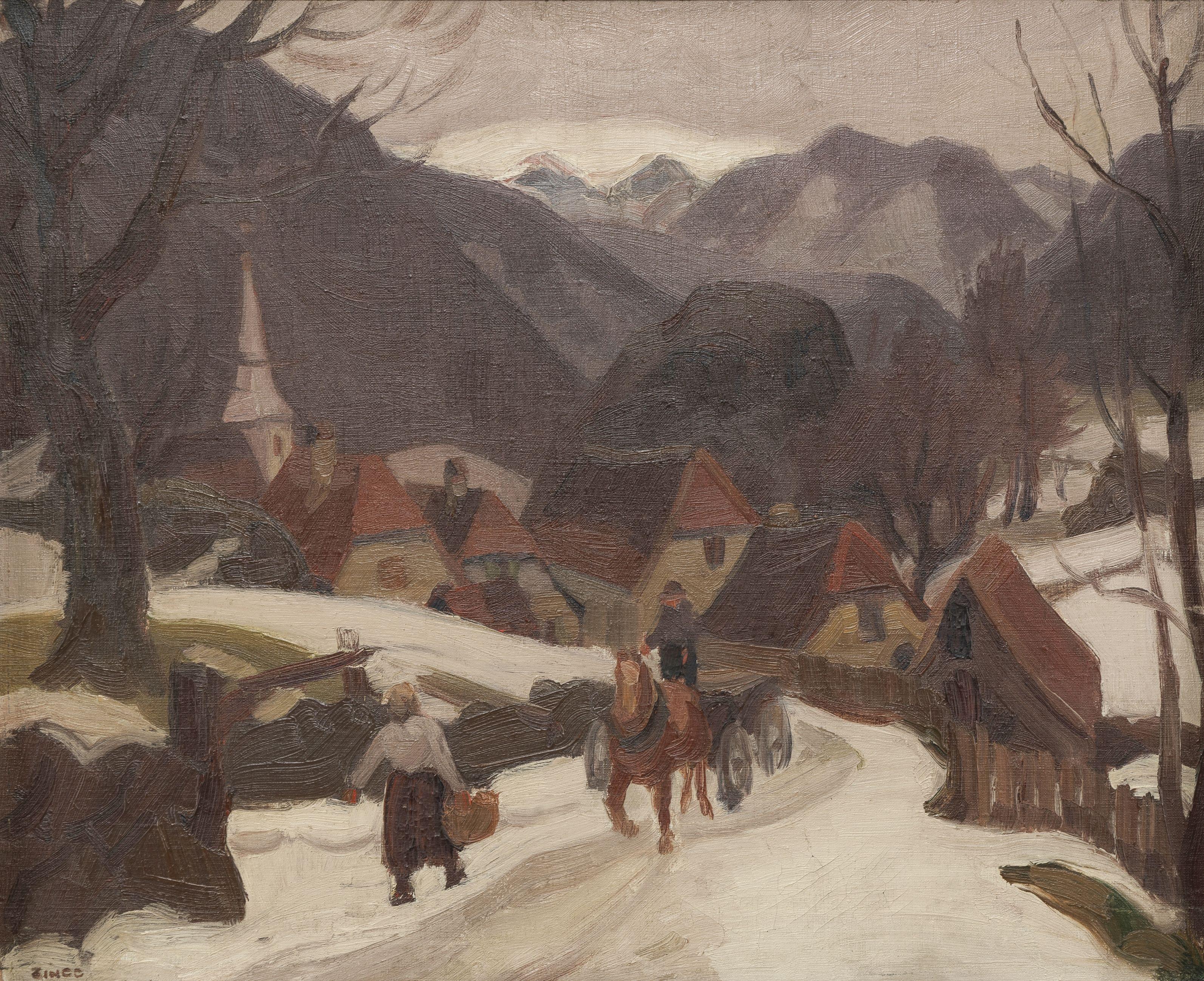Chariot à l'entrée du village sous la neige, huile sur toile, signée, 58x75 cm