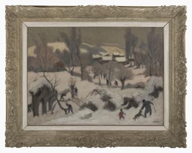 Village en hiver avec des enfants sur une luge, huile sur pannea...