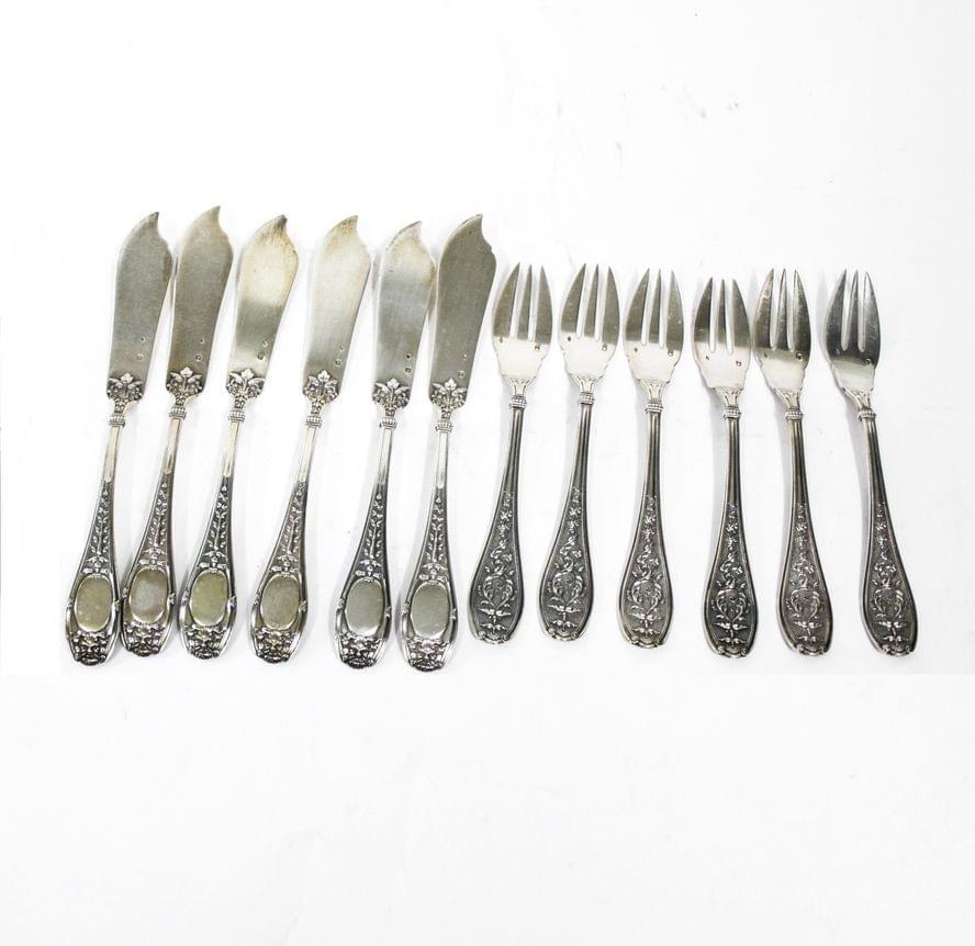 3327. 6 fourchettes et 6 couteaux à poisson, décor rinceaux