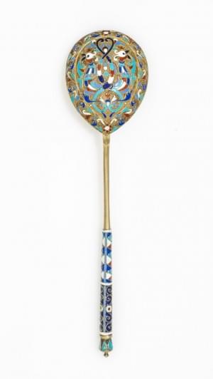 131. Paire de cuillères manche imitant le bois sommé d'un ourson, Rus...